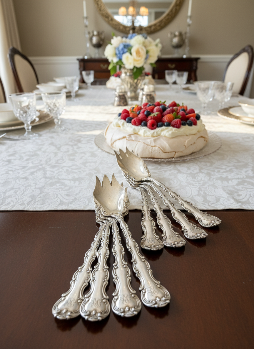 Similar to a modern spork, but refined and high class. Often made from silver or silverplate, with ornate styles and handles that matched other silverware.
