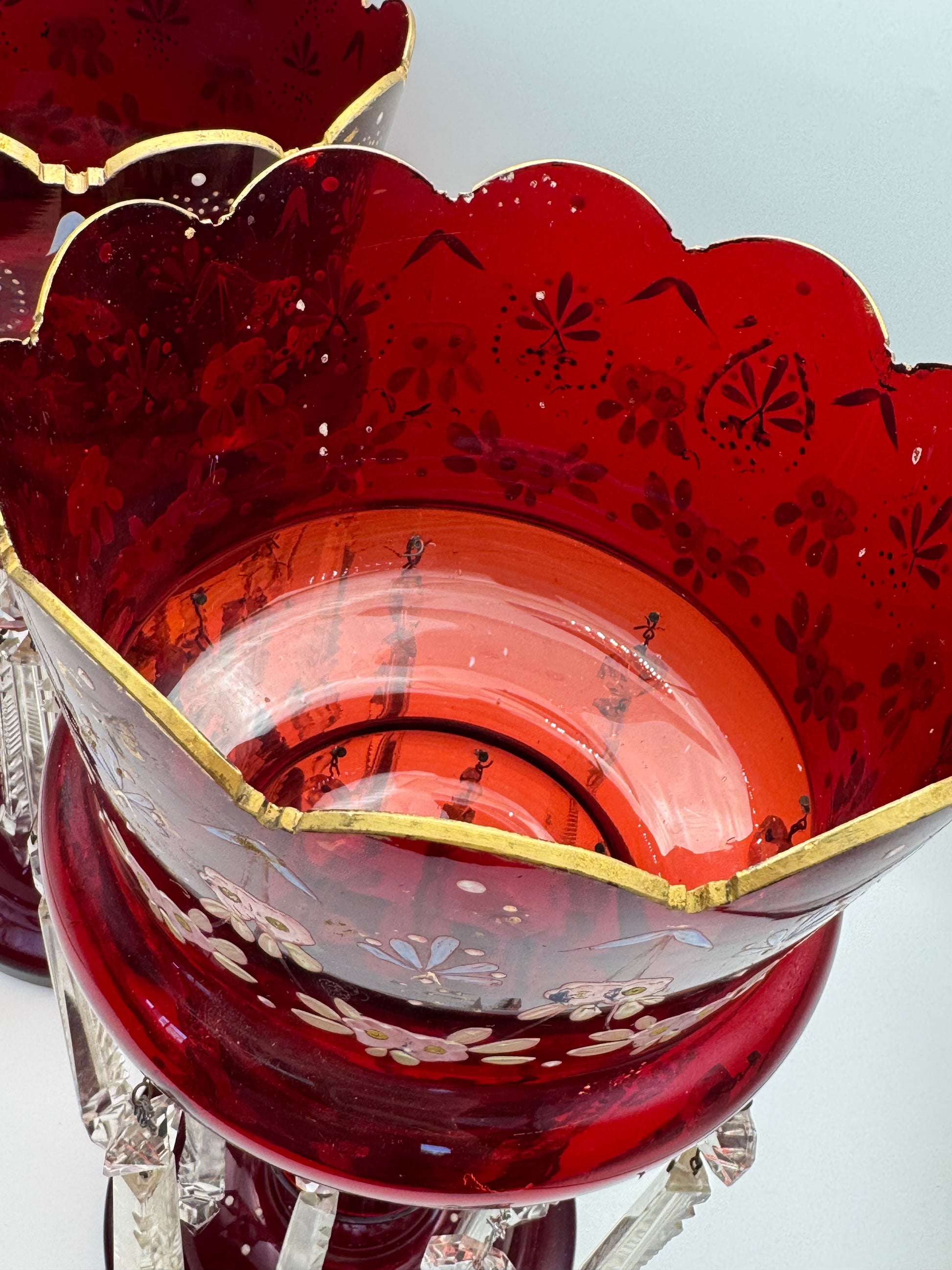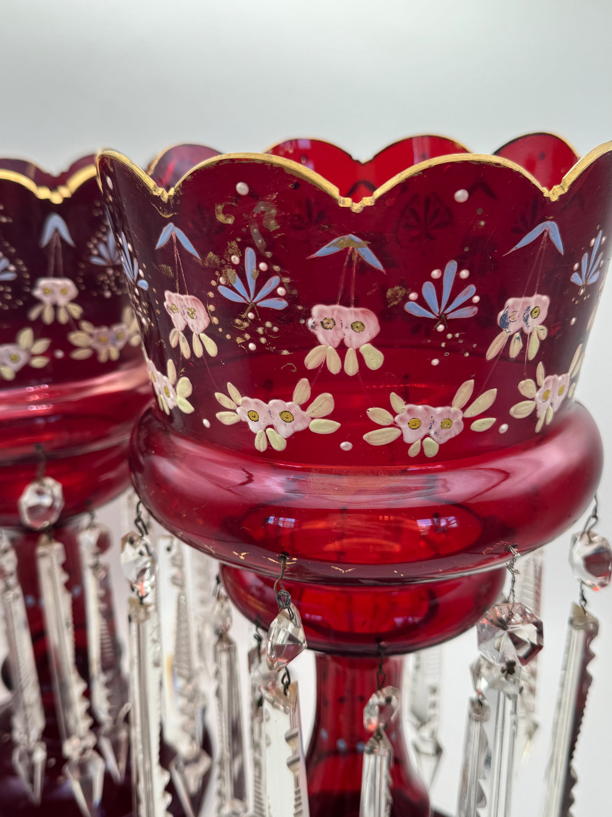 Pair of Victorian Cranberry Glass Mantle Lusters with Prisms, circa late 19th century. Each stands approximately 15” tall by 7” wide, crafted in rich ruby glass with scalloped rims, gilt trim, and hand-painted enamel floral decoration. Two rows of cut glass prisms catch and reflect the light beautifully, creating a dramatic display.