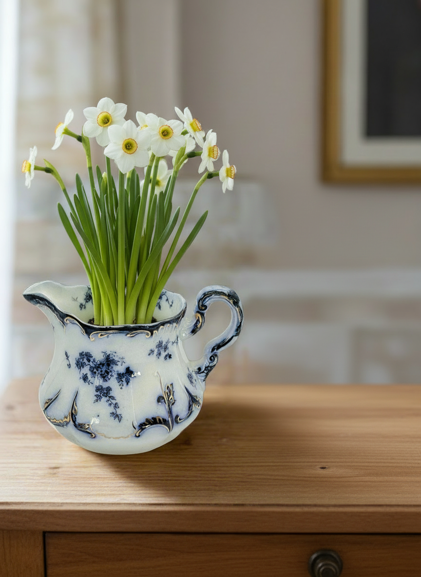 This is a rare antique Ridgways China creamer from England in the Chiswick pattern. It is made of semi-porcelain in a blue color. The creamer is a single item in the set and showcases a blue floral design with beautiful gold accents.