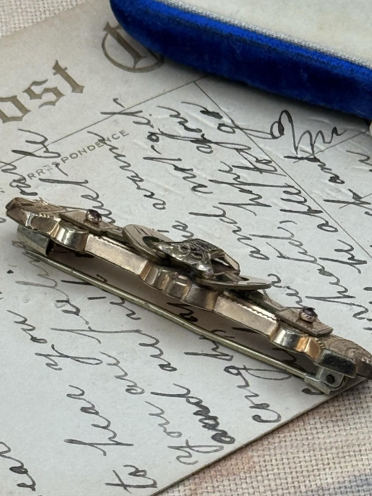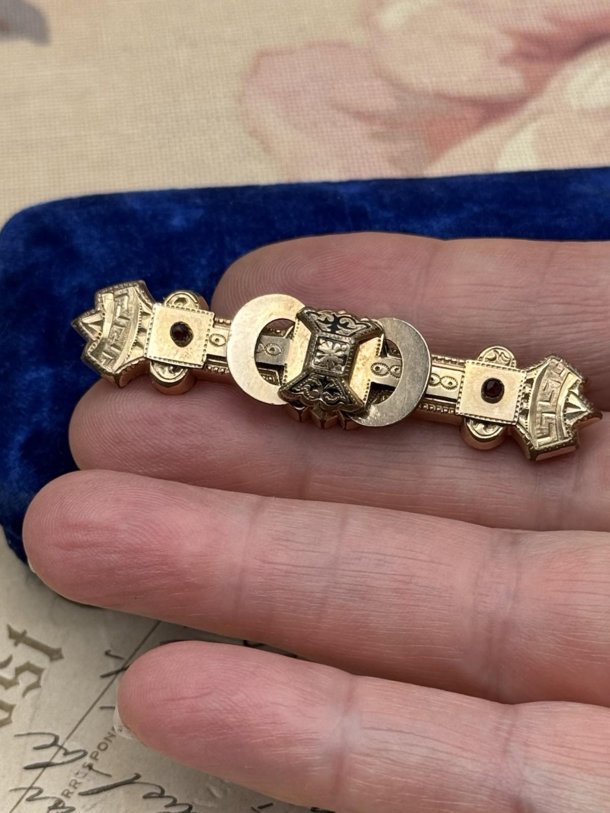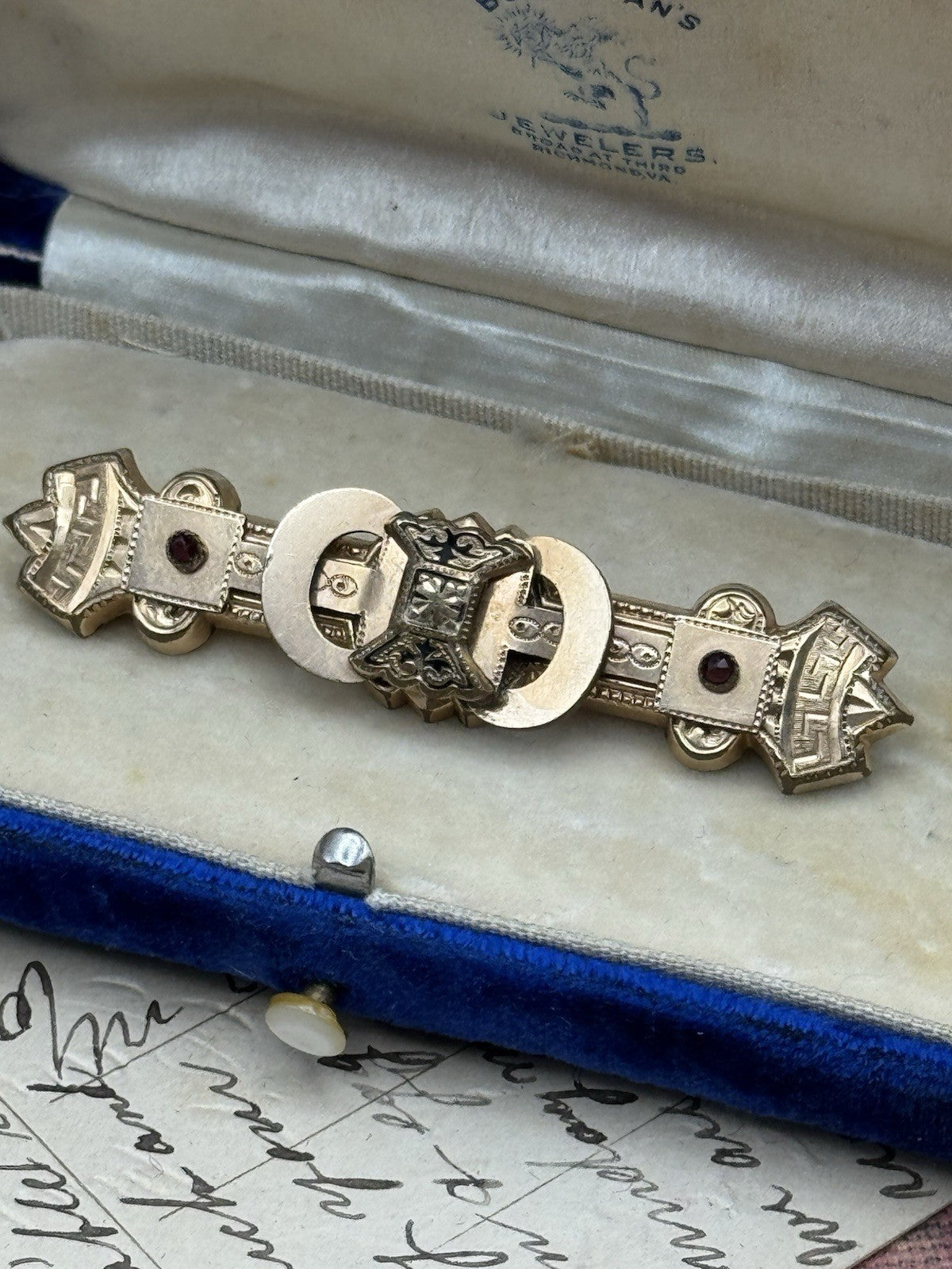 This exquisite Edwardian bar brooch (circa early 1900s) is beautifully crafted in gold-filled metal with an ornate geometric design featuring buckle motifs and delicate hand-engraved detailing. The brooch is set with two small garnet-red glass stones and a central clear paste accent, giving it a touch of sparkle.