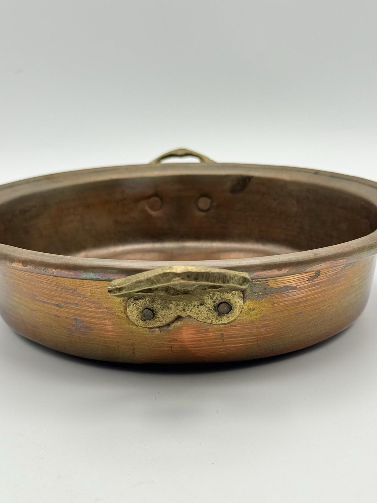 The copper has developed a rich, warm patina from decades of use, adding character and authenticity that collectors and chefs alike appreciate. Whether styled as functional cookware, displayed in a country kitchen, or repurposed as a decorative serving or catchall piece, this pan embodies old-world charm.