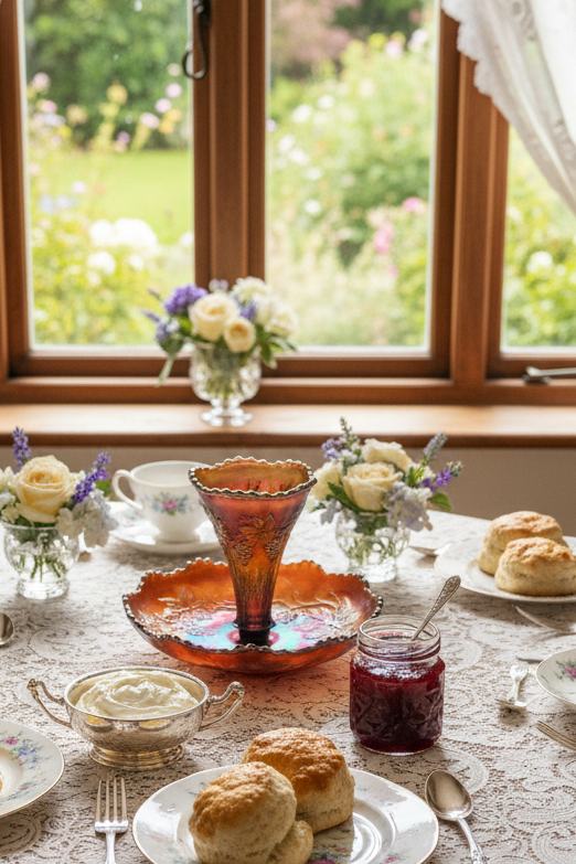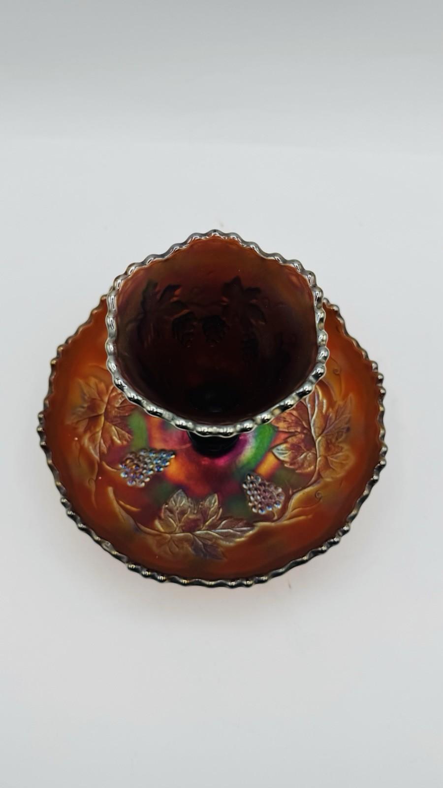 This elegant antique carnival glass epergne comes from a lifelong private collection and showcases the rich, glowing colors that made American iridescent glass so beloved in the early 20th century. Featuring a beautifully flared trumpet vase rising from a grape and leaf patterned base, this piece captures the romance and decorative artistry that defined classic Fenton carnival glass.