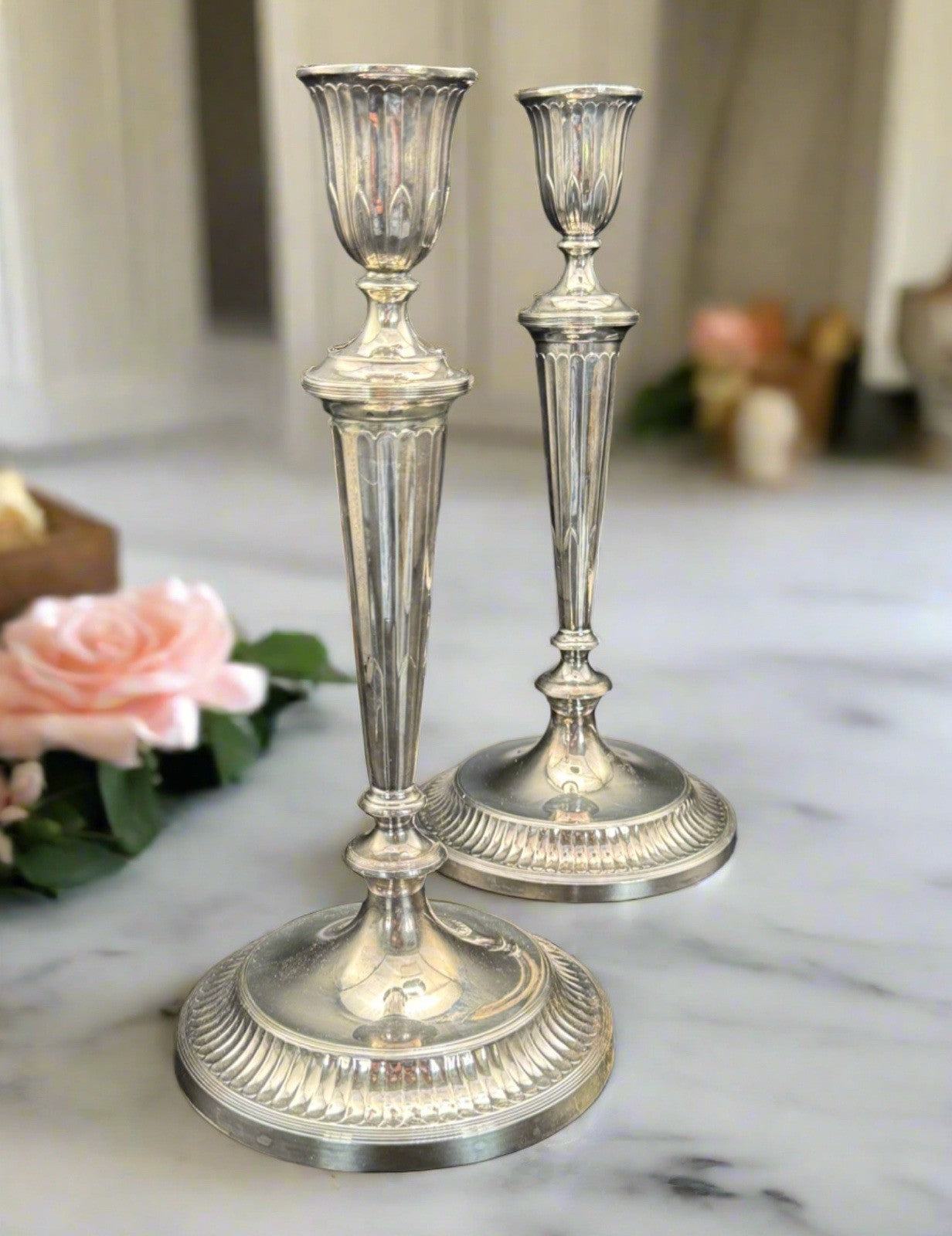 George III STYLE Candle Stick Pair Antique Silverplate 11”h ESTATE FIND