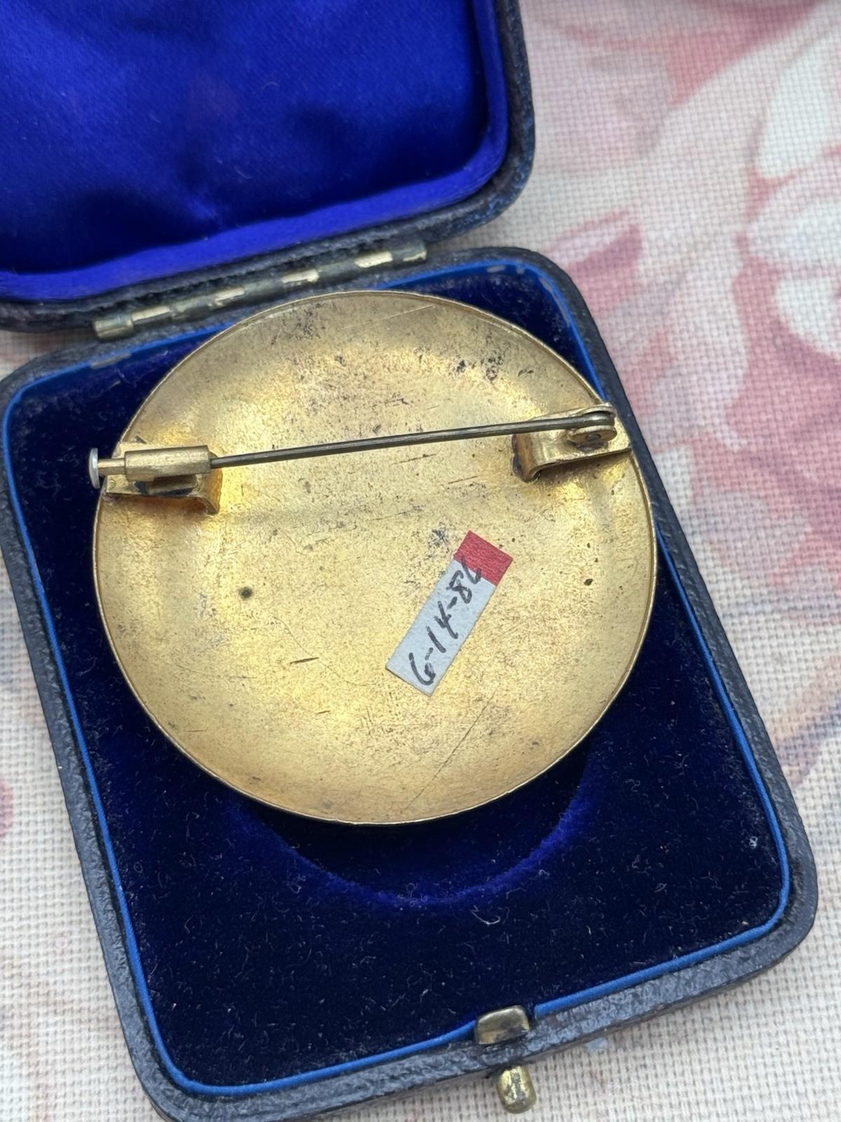 This is a fine example of European hand-painted jewelry art, combining skilled miniature painting with an elegant circular brooch form. Collectors of antique enamels, portrait and floral jewelry will find this a rare and desirable piece.