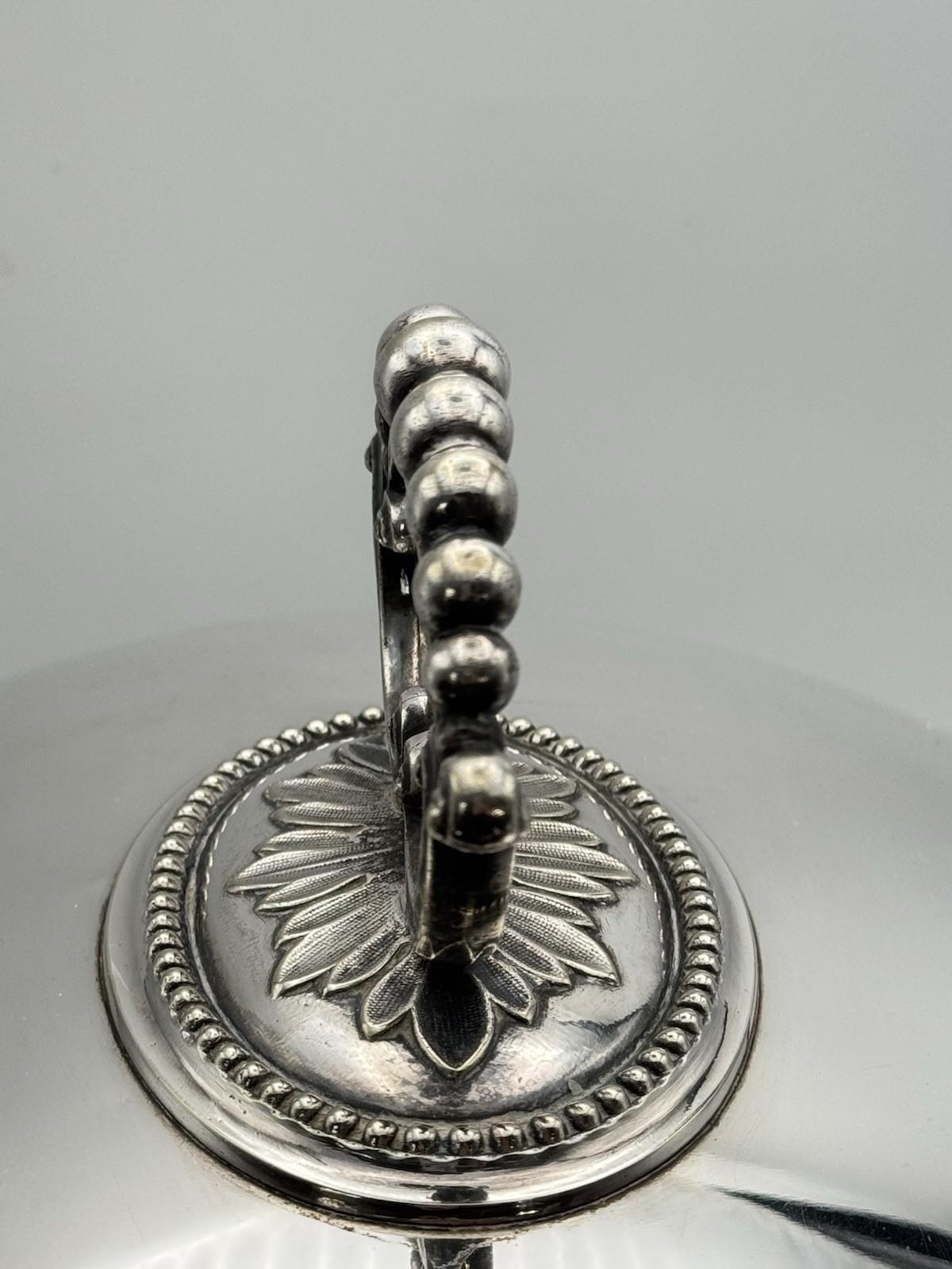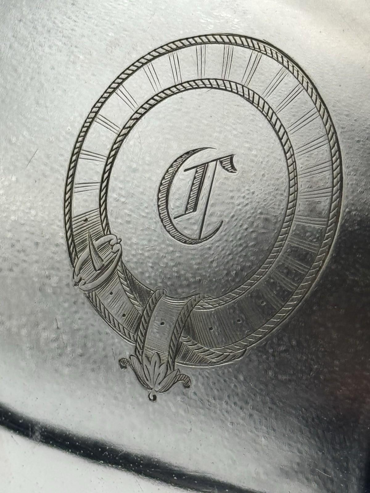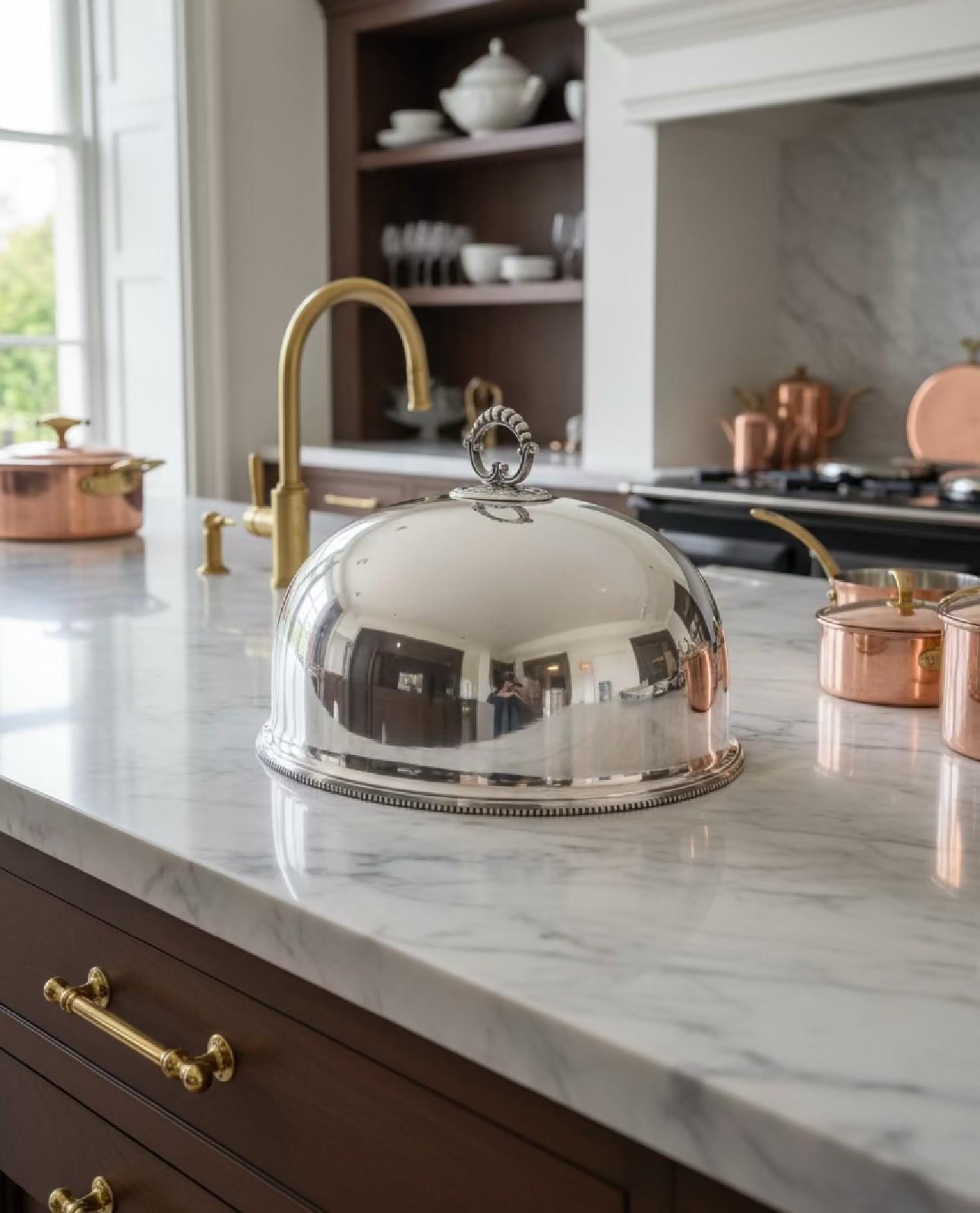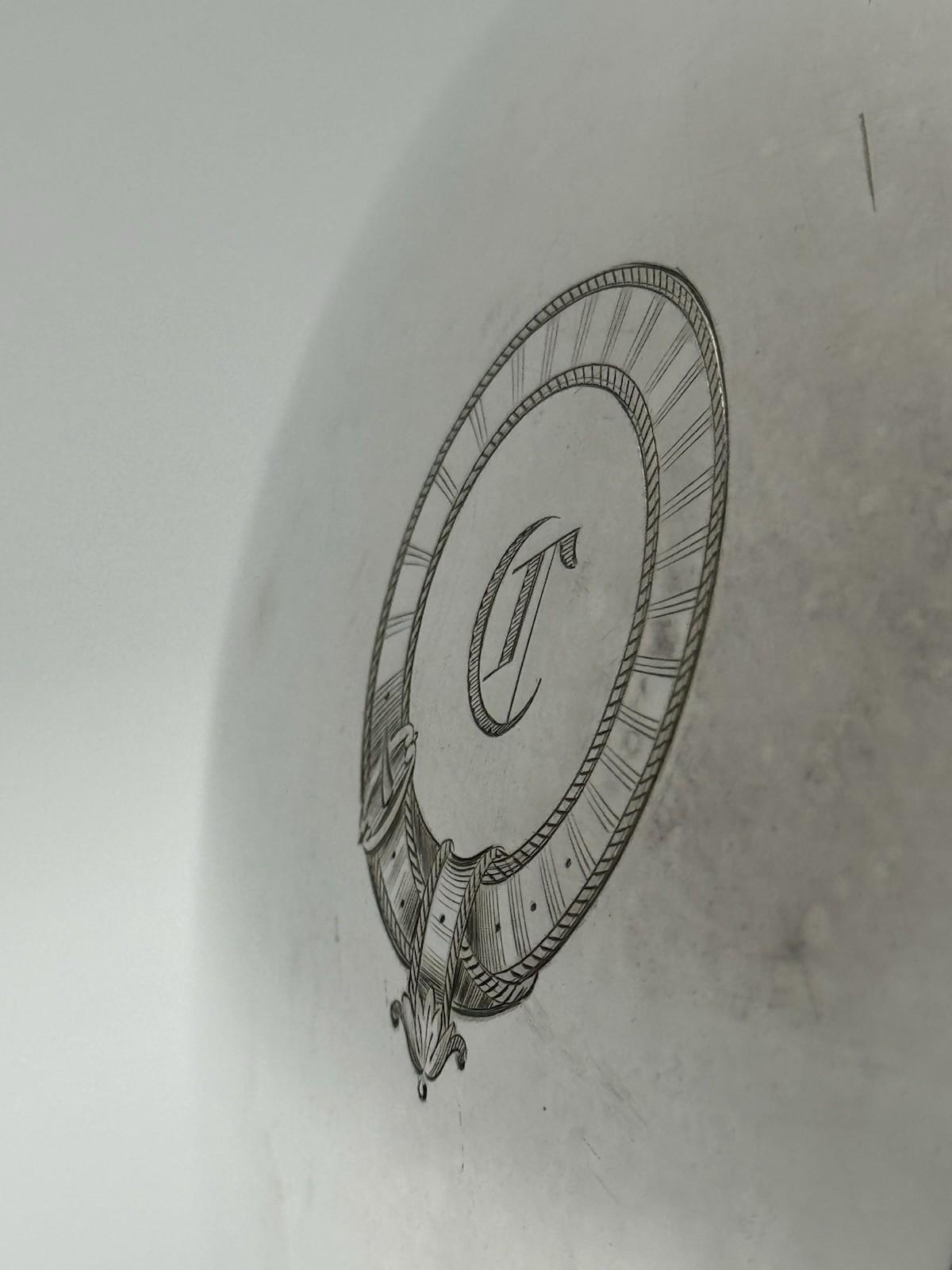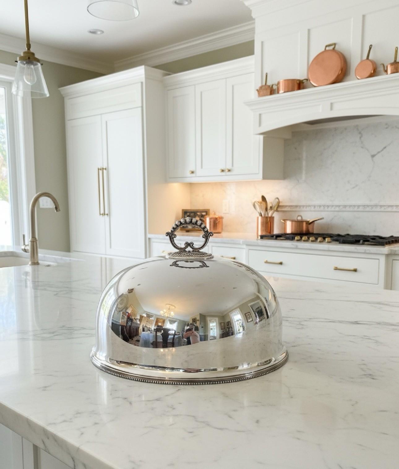 The dome features an ornate removable handle, making it both functional and easier to polish or store. A monogram adds a touch of history and personalization, a reminder of its original distinguished household.