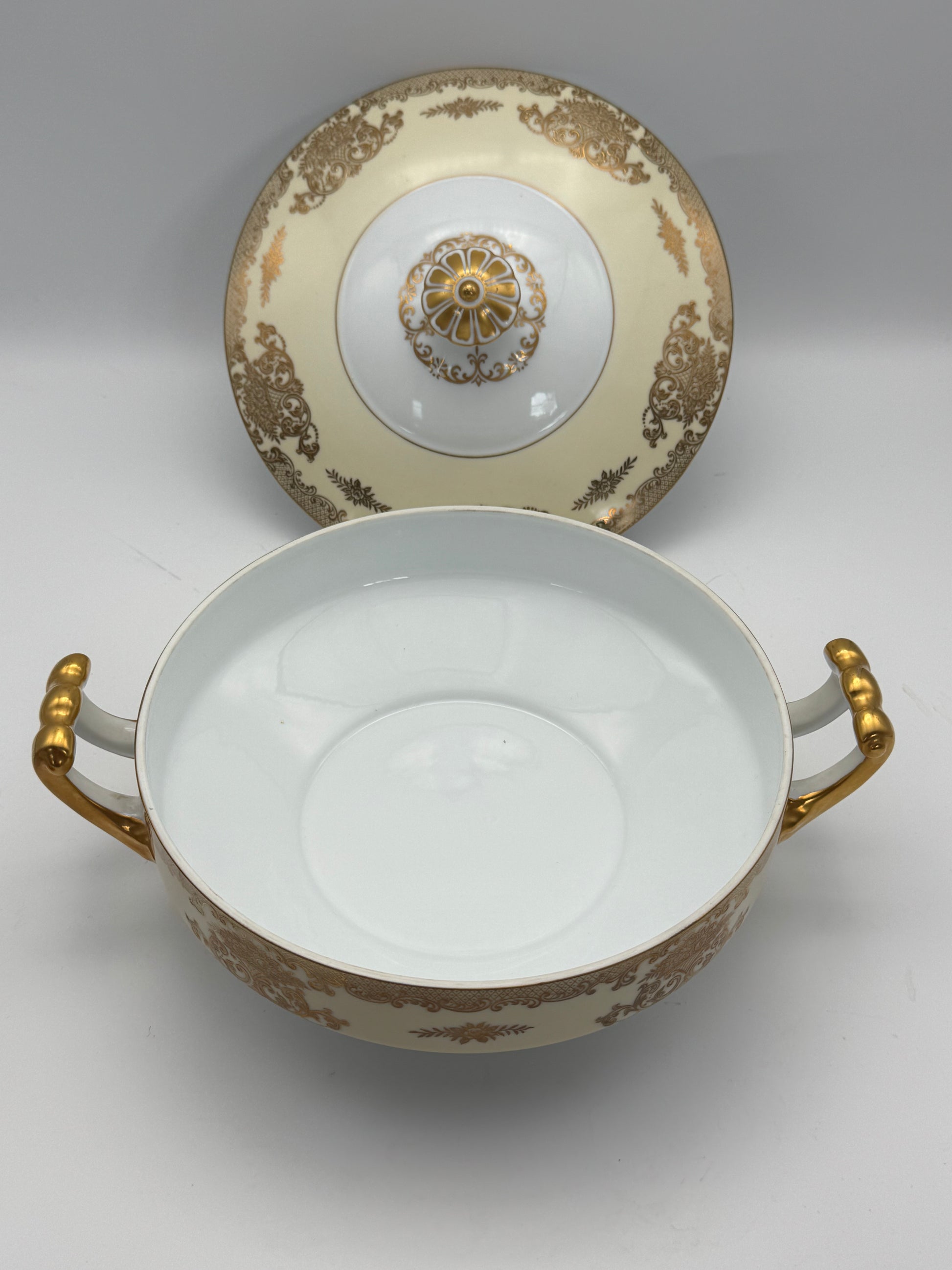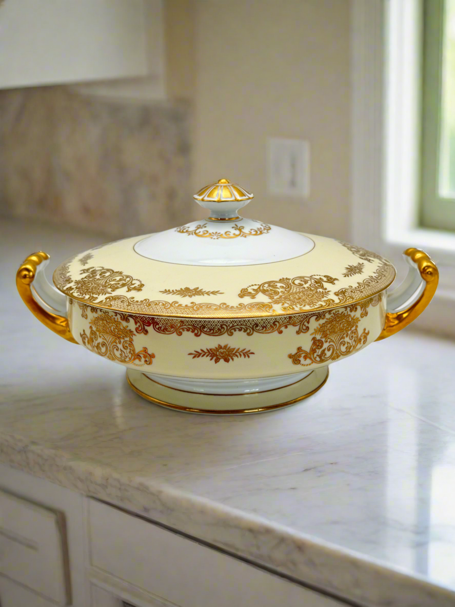Bring timeless elegance to your table with this beautiful round covered vegetable dish in the beloved Mayfield pattern by Noritake. Featuring delicate floral sprays in soft hues framed by a cream border with subtle gold accents, this dish embodies refined vintage charm and speaks gilded age elegance.