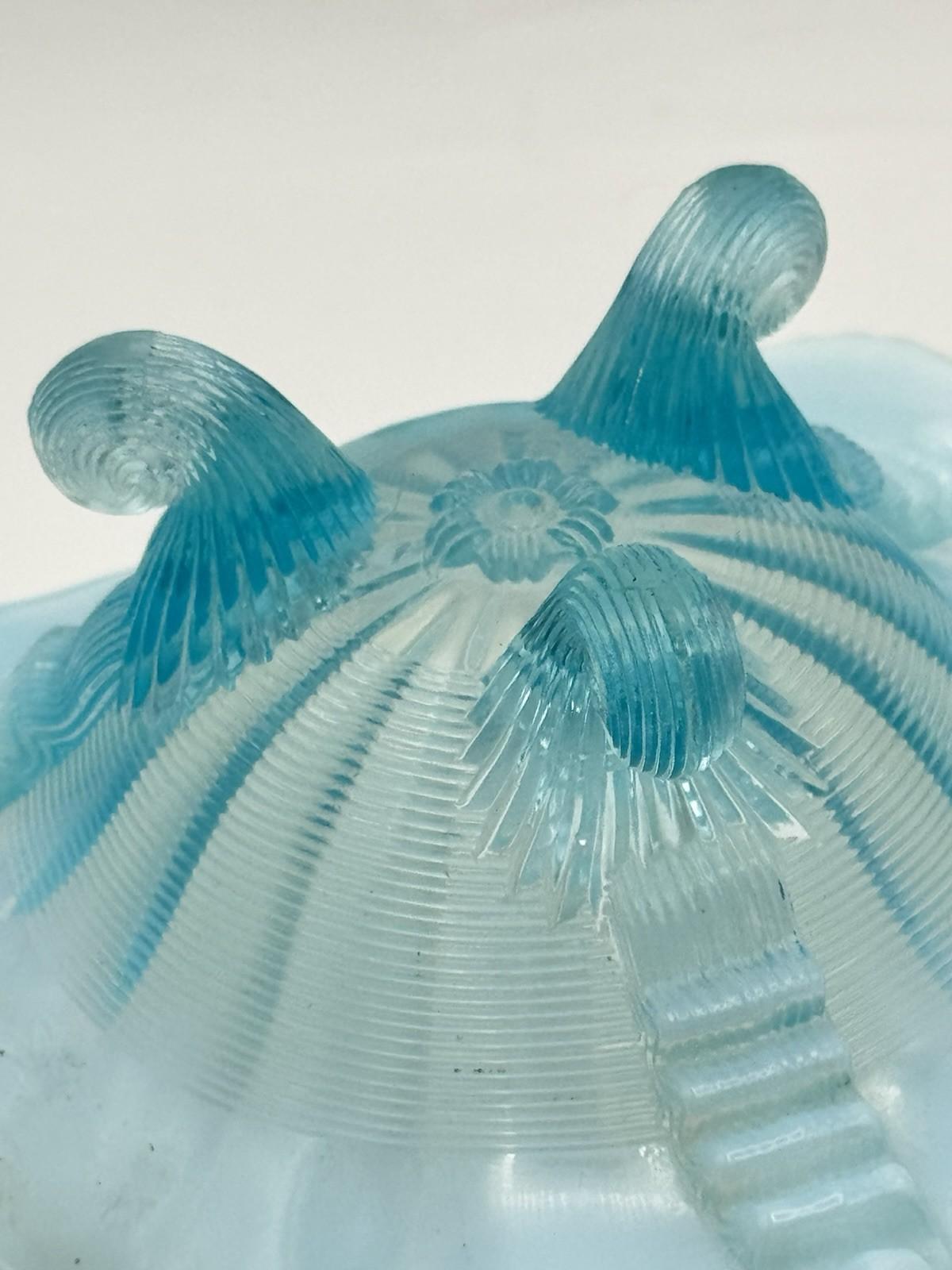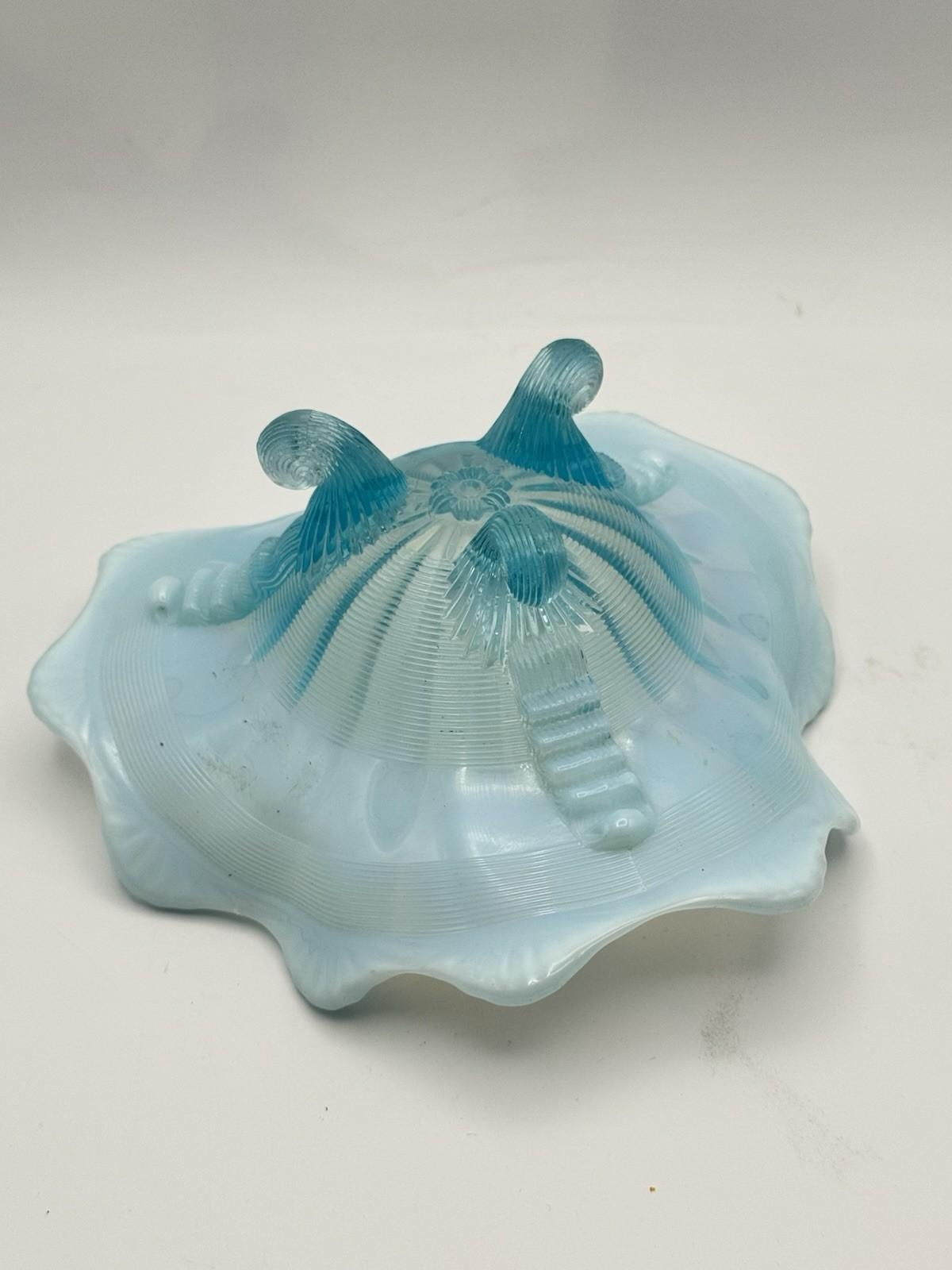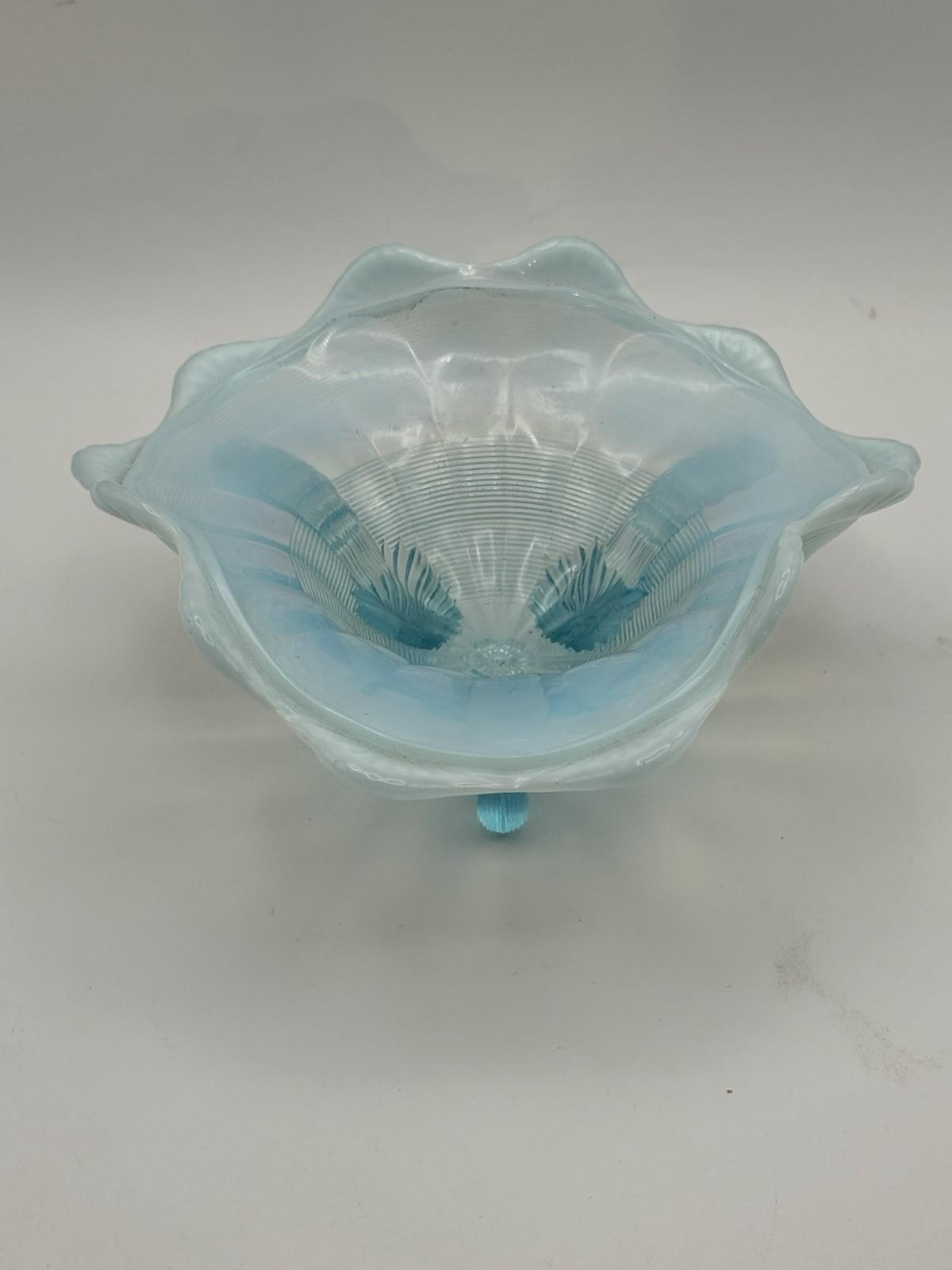 This dreamy blue opalescent art glass bowl is such a little show-stopper. The glass shades from soft milky white into aqua blue, with fine ribbed detailing and three stylized floral bursts in the base that catch and reflect the light beautifully. It stands on three scroll feet that lift the bowl up and give it a graceful, elevated profile on the table.