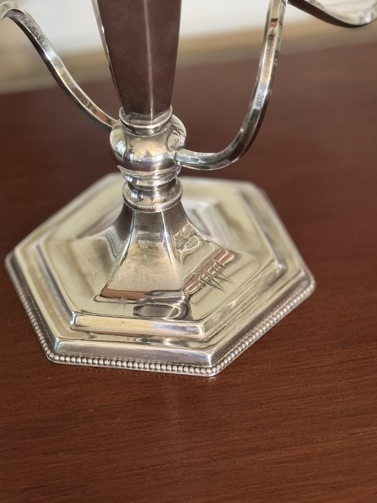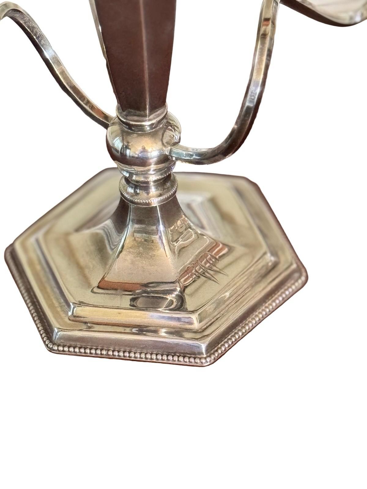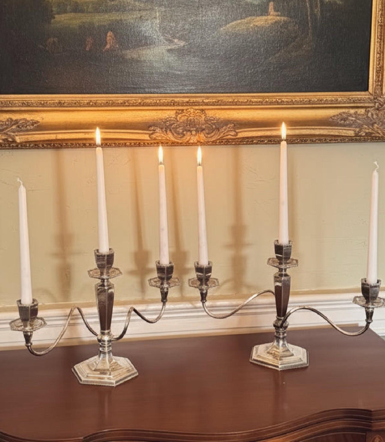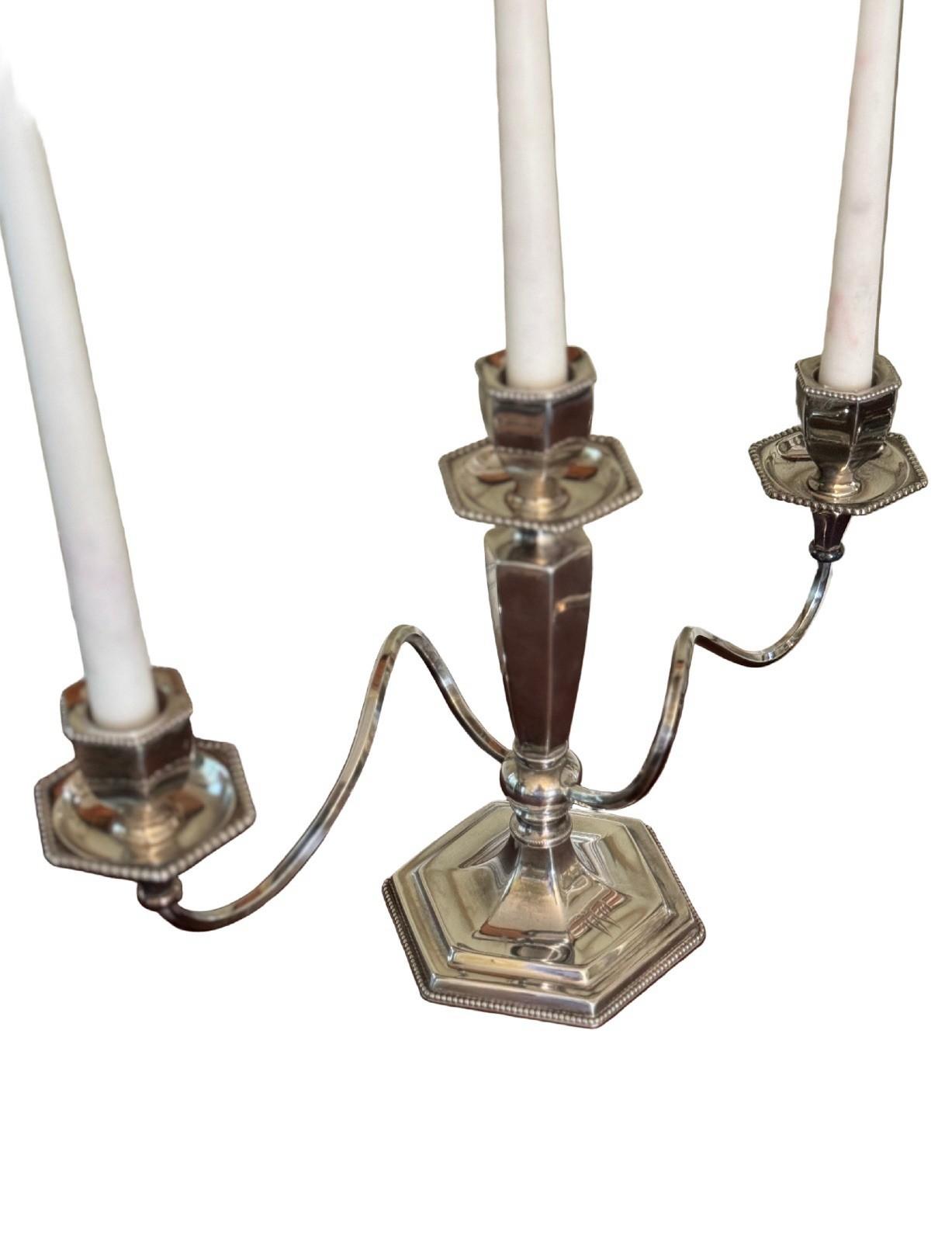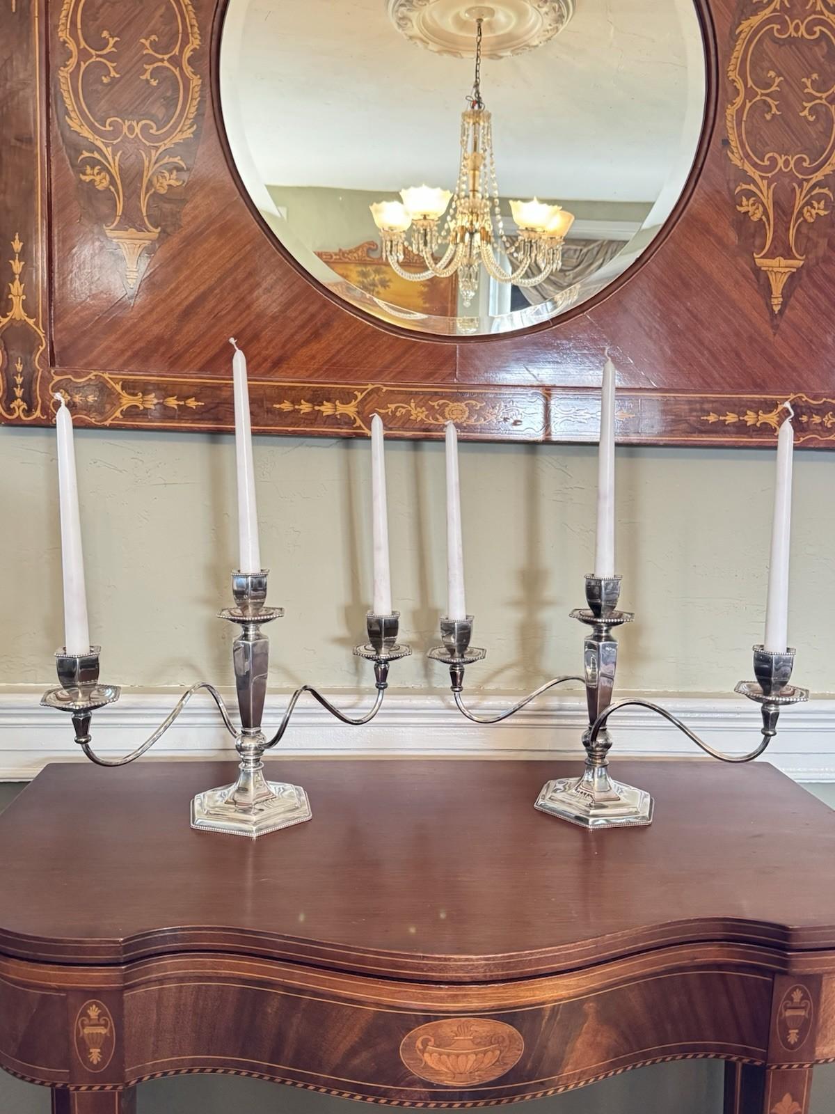 Elegant pair of antique Poole quadruple silverplate candelabra, each featuring three graceful arms, a hexagonal beaded base, and timeless neoclassical styling.