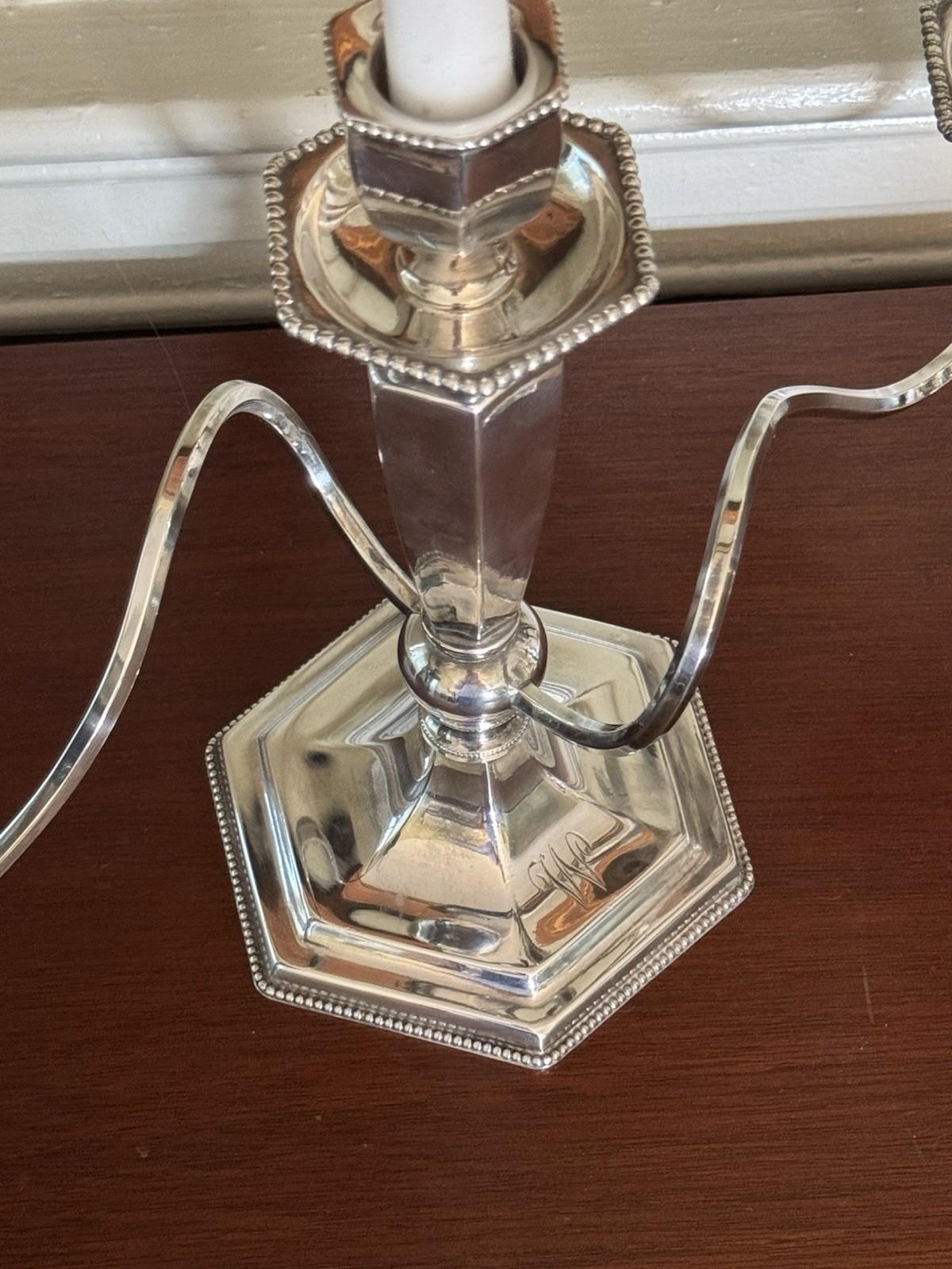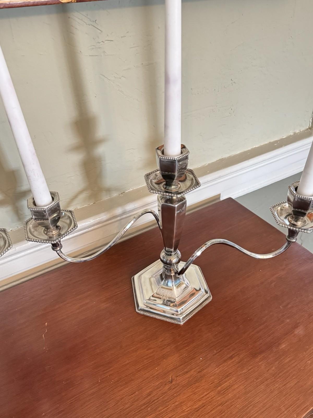 Pair Antique Poole Quadruple Silverplate 3-Light Candelabra Monogram W/M