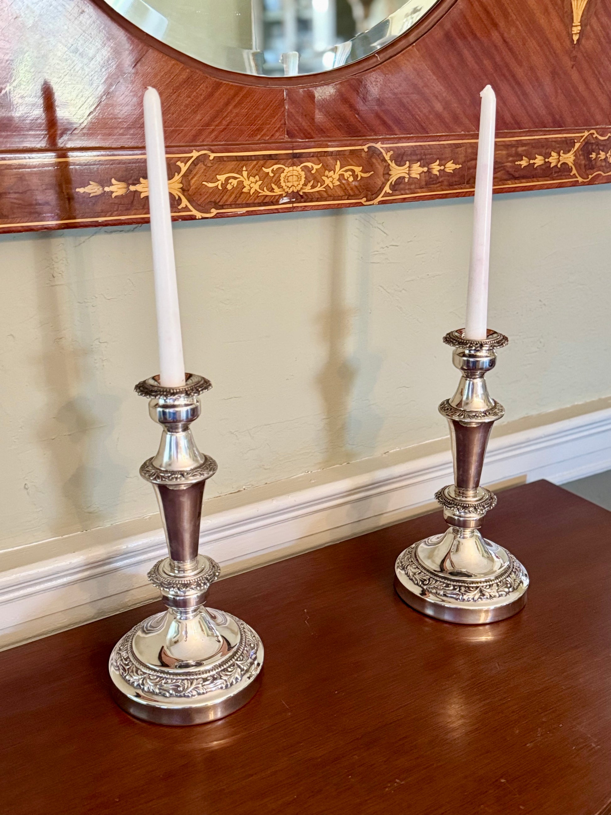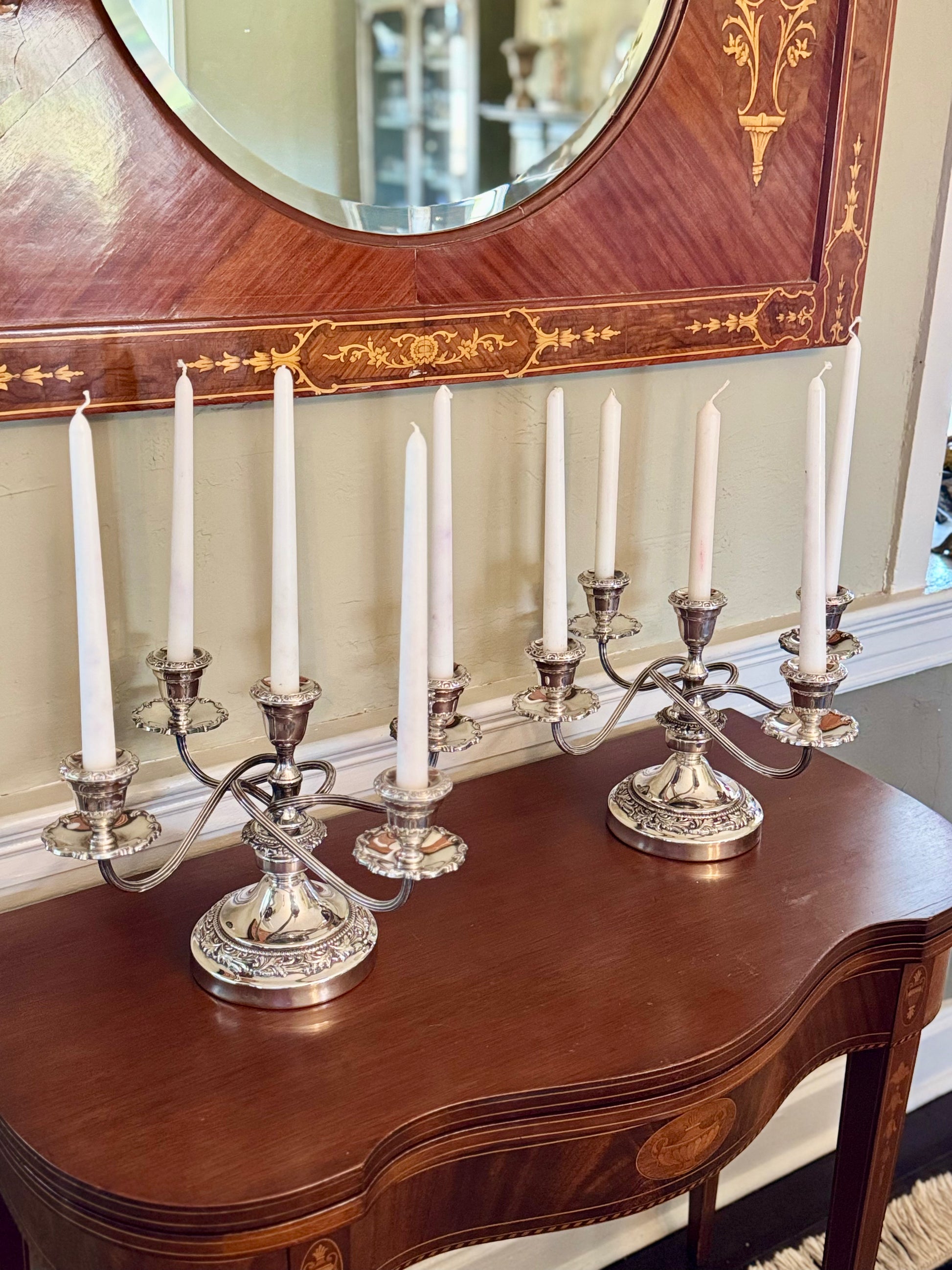 A truly versatile pair of vintage silver-plated candelabra, perfect for elegant dining or decorative use. Each piece is cleverly designed to be displayed in four distinct ways: tall 3-light candelabra, shorter 3-light candelabra, tall single candlesticks, or short single candlesticks. Ornate scroll and floral details accent the silver plate, making these pieces as decorative as they are functional. Don’t forget the 5 Arm topper is another combination!