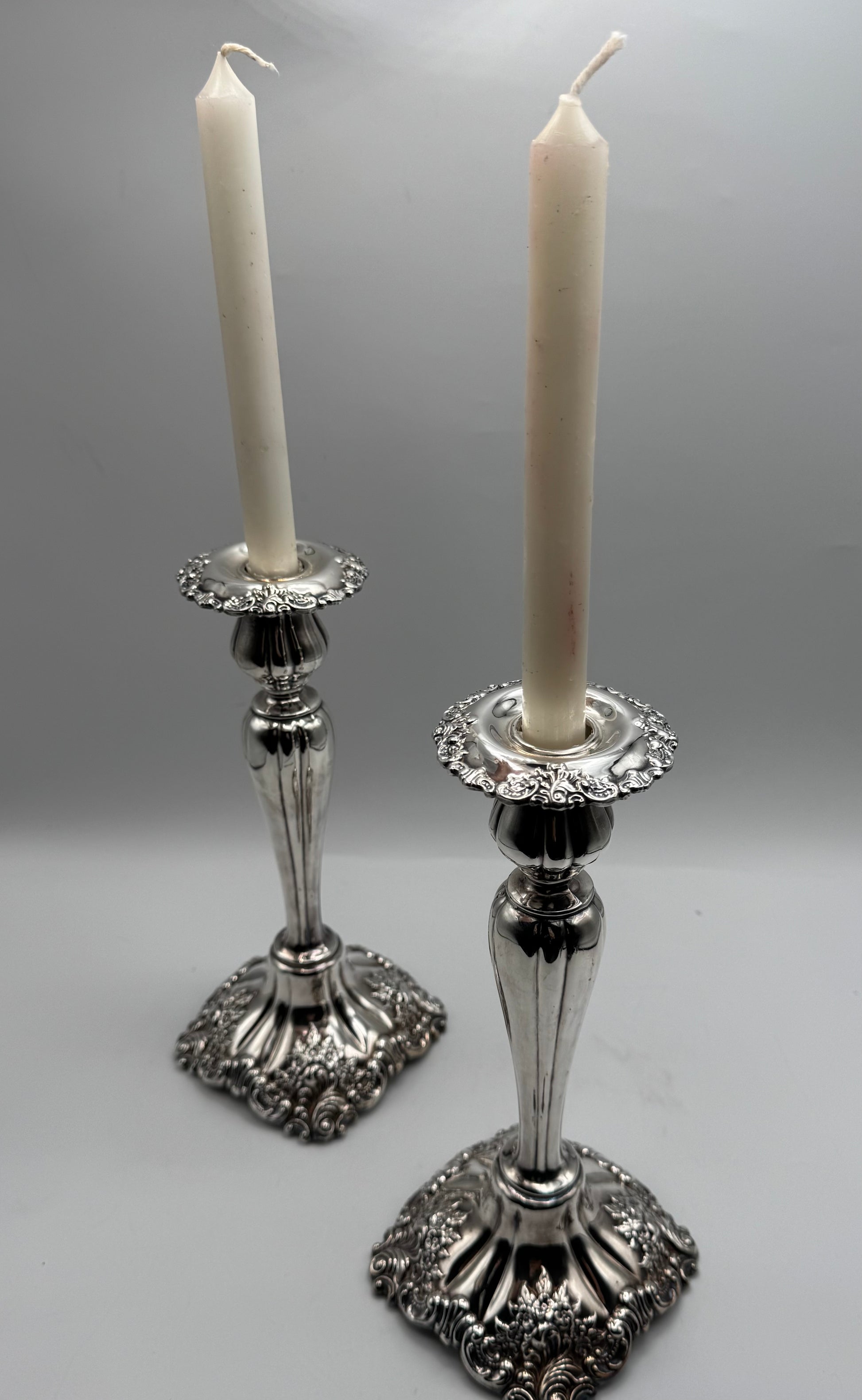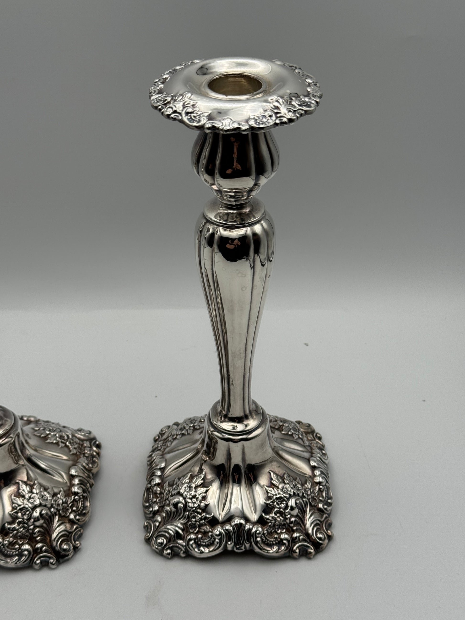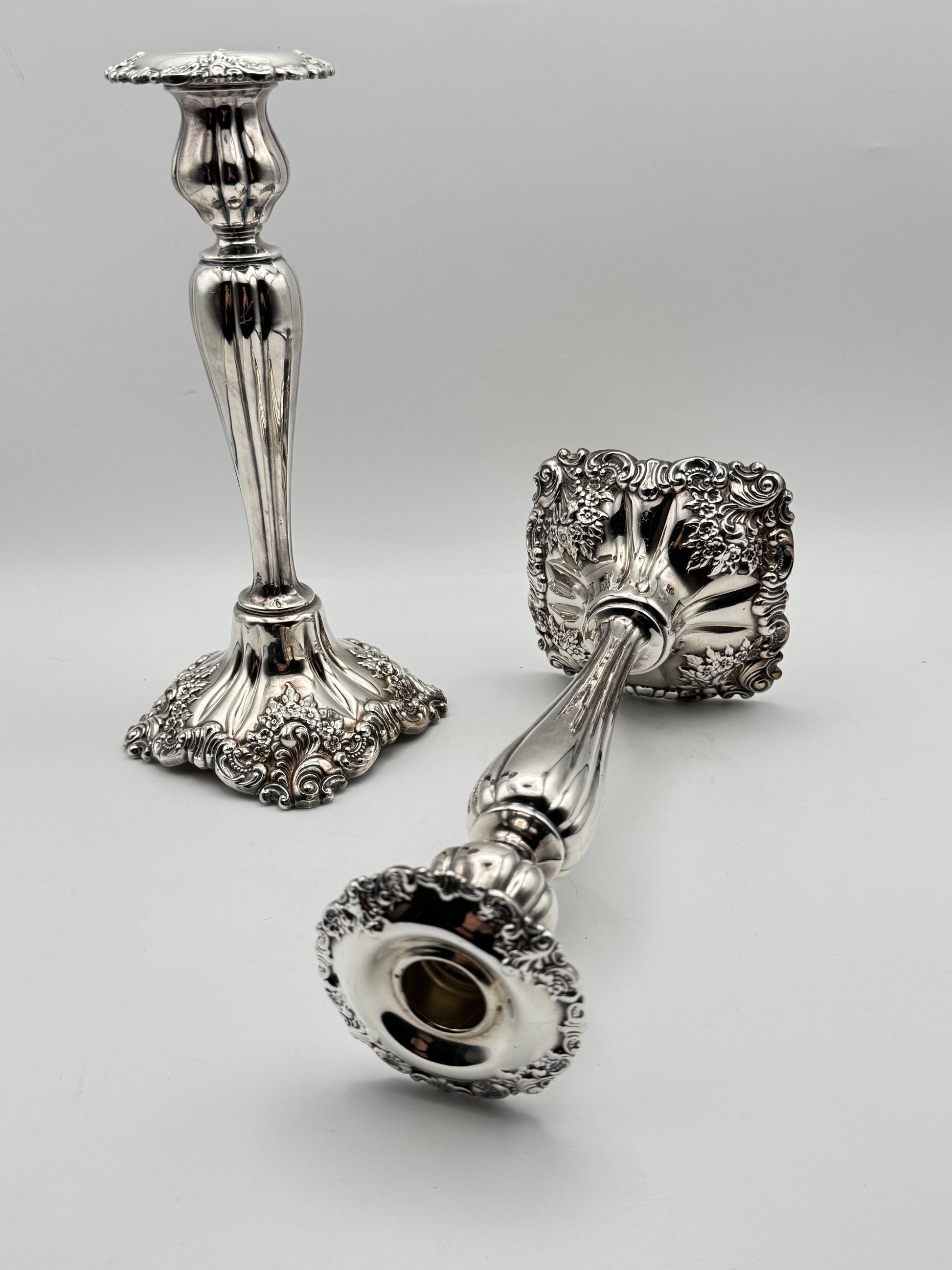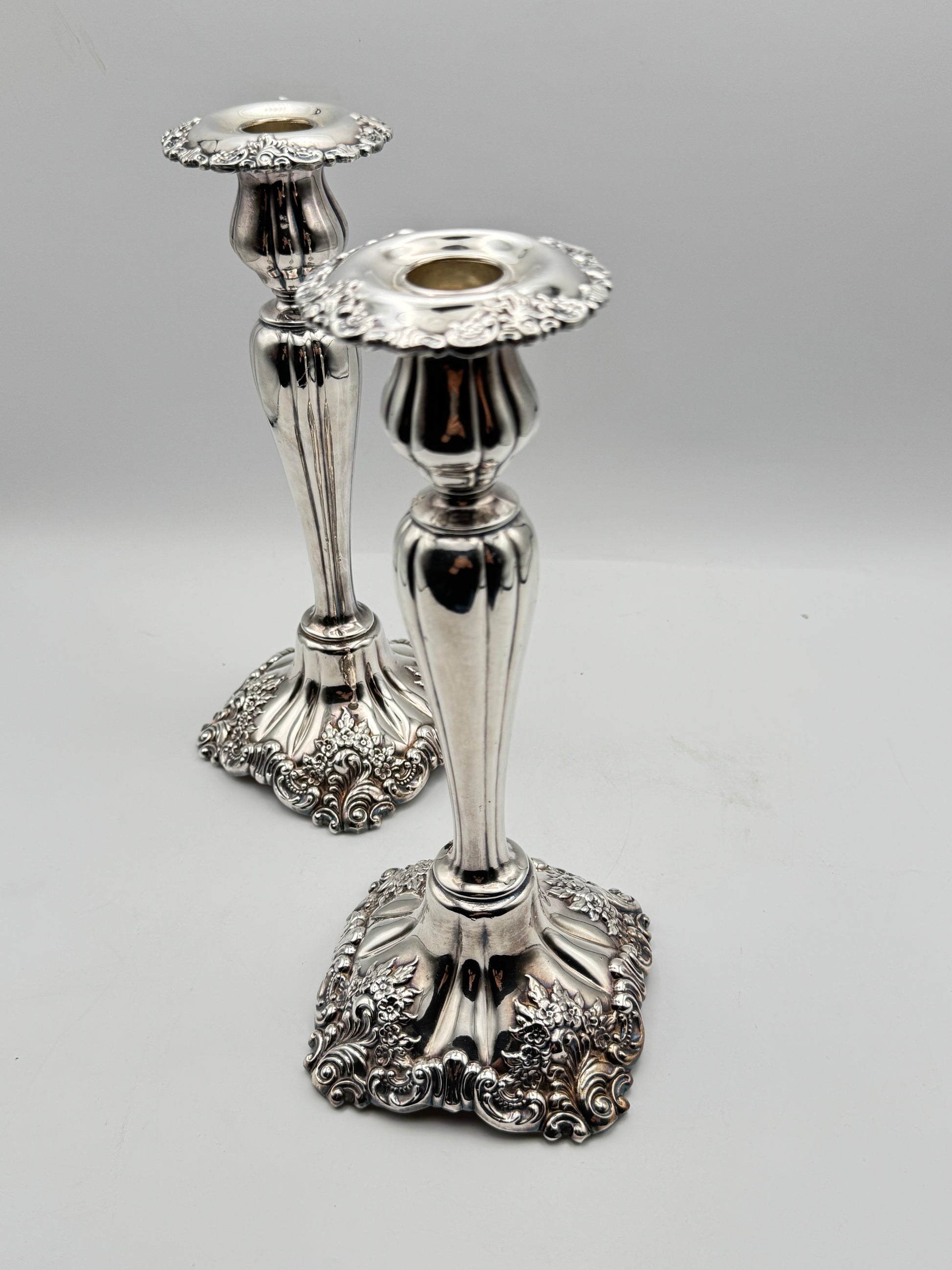 Elegant and substantial pair of Wallace silverplate candlesticks, each standing approximately 10 inches tall with ornate repoussé floral and scrollwork detail throughout.