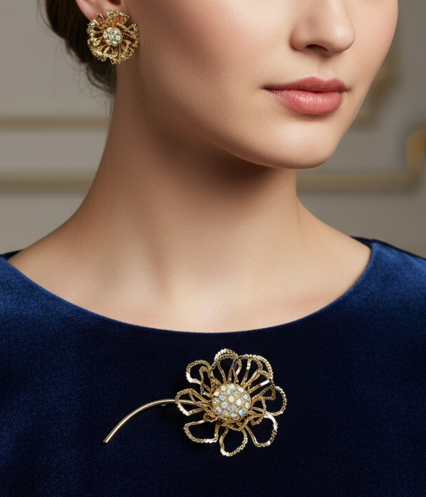Sarah Coventry Brooch & Earrings Allusion Flower AB Rhinestones Vintage 1968