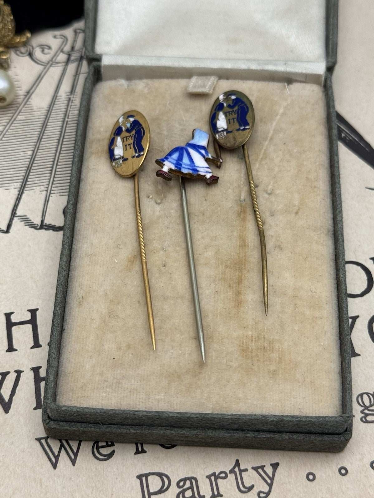 This set of 3 advertising stick pins features enamel designs showcasing Dutch Butter and Dutch Cleaner themes. The golden pins measure circa 2.25" in length, making them versatile accessories for all occasions. The unisex adults can wear these vintage pieces as a unique fashion statement with a touch of nostalgia. The pins come in a vintage case for easy storage and gifting.