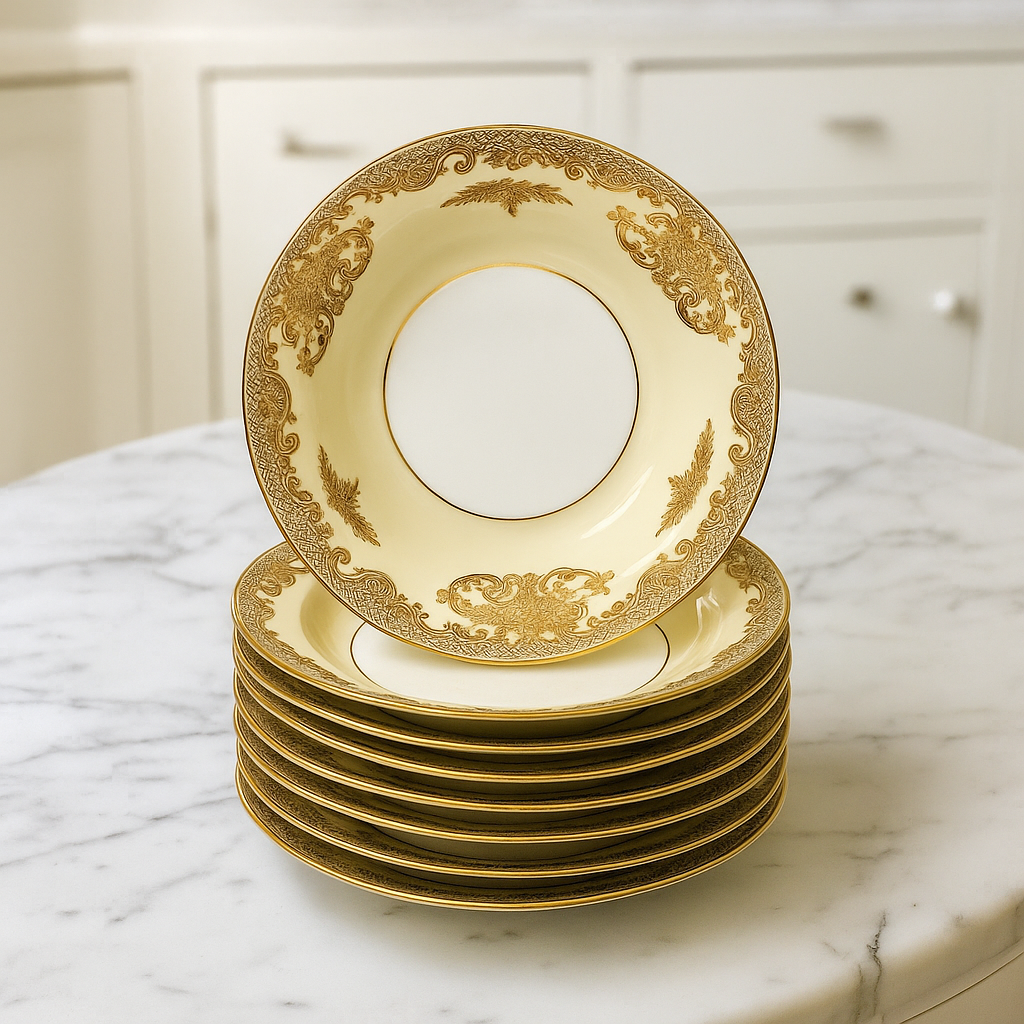 Bring timeless elegance to your table with this beautiful set of eight fruit or dessert bowls in the beloved Mayfield pattern by Noritake. Featuring delicate floral sprays in soft hues framed by a cream border with subtle gold accents, these bowls embody refined vintage charm and speak gilded age elegance.