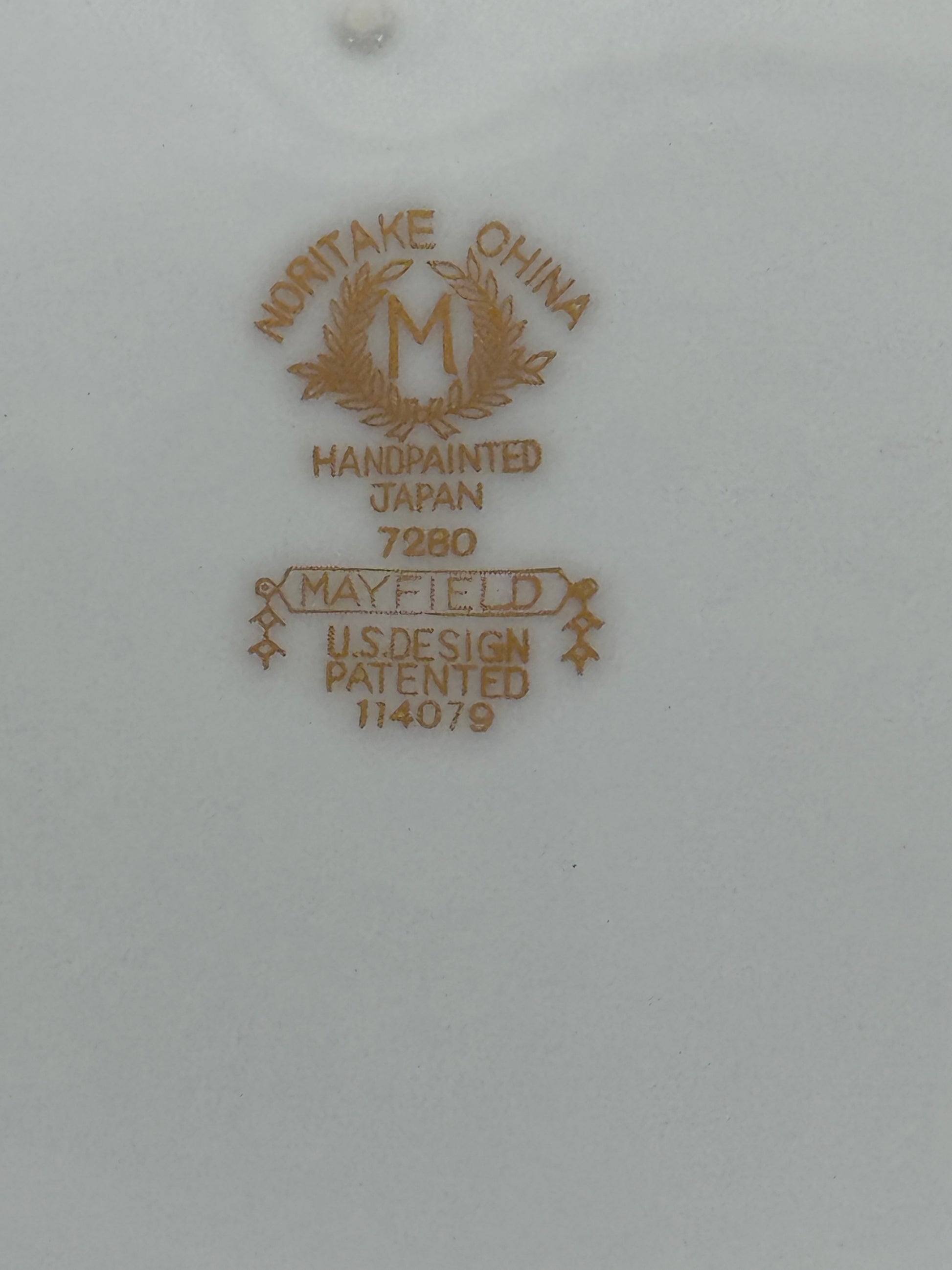 Bring timeless elegance to your table with this beautiful set of eight dinner plates in the beloved Mayfield pattern by Noritake. Featuring delicate floral sprays in soft hues framed by a cream border with subtle gold accents, these plates embody refined vintage charm and speak gilded age elegance.