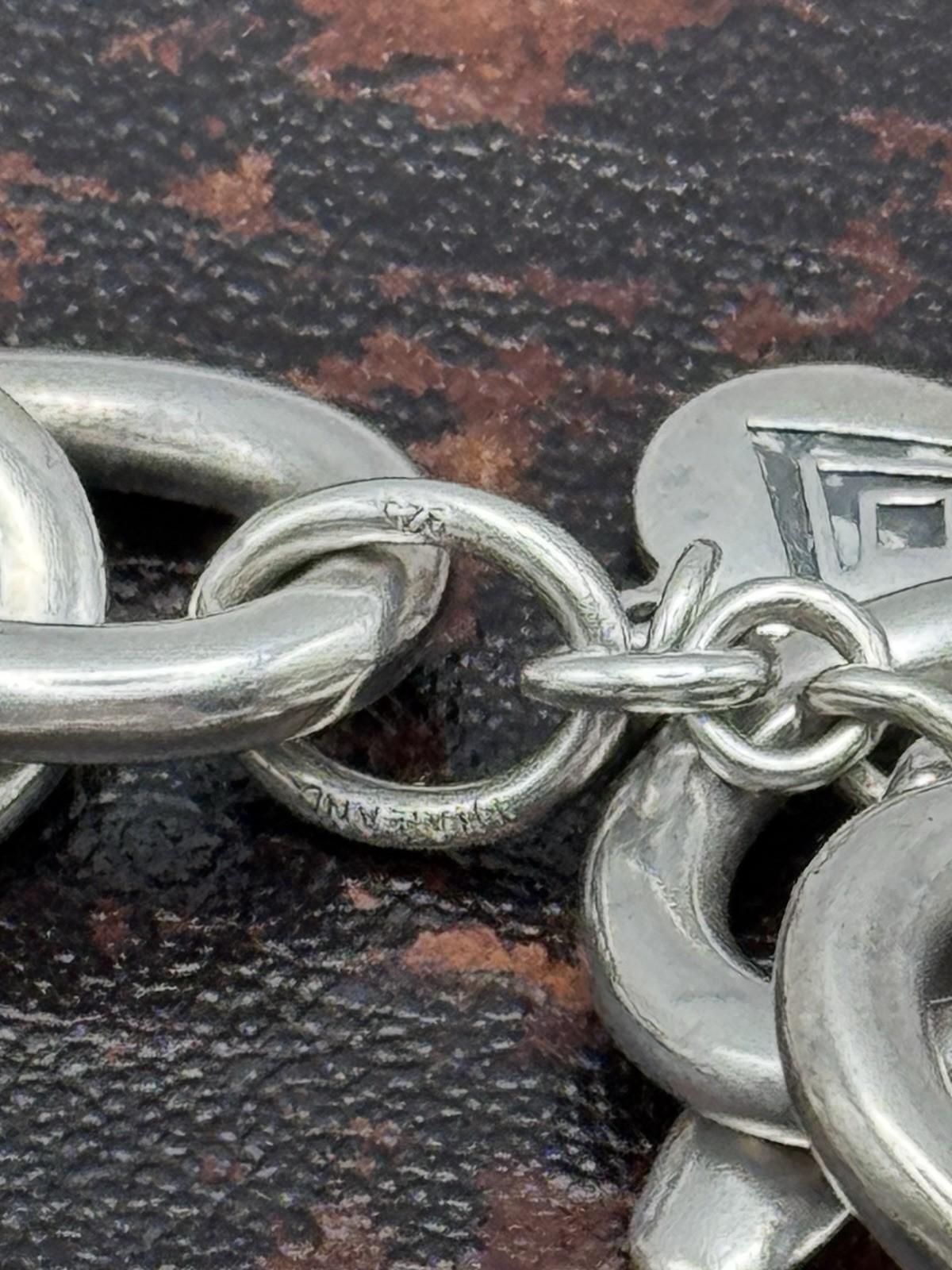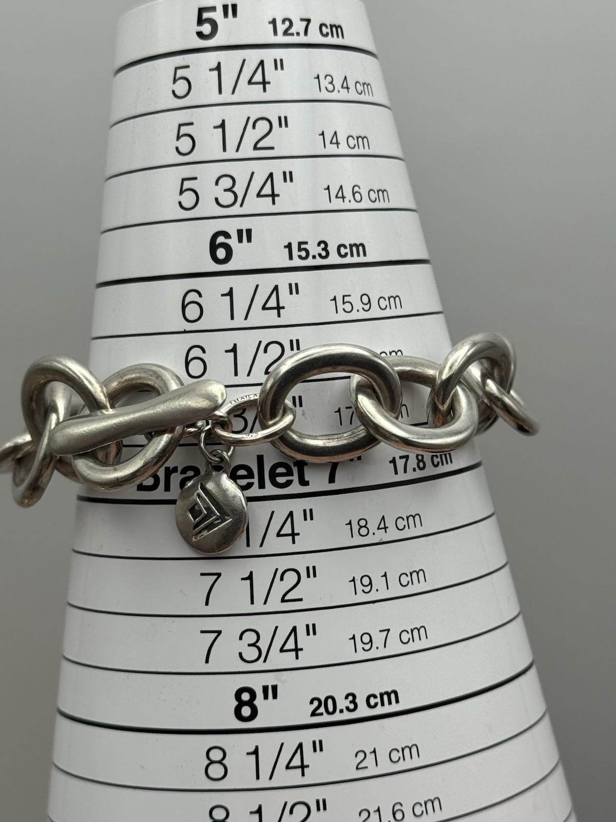 This substantial designer bracelet has a total length of approximately 8.25”, but because of the chunky links and toggle, it best fits a wrist in the 6.5” to 6.75” range (snug to comfortable, depending on preference). The links measure about 0.6” wide, giving the bracelet strong visual presence and a luxurious feel on the wrist.