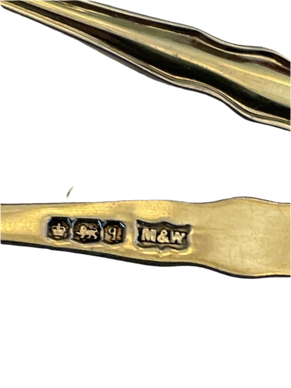 This original Art Deco set dates back to 1920-1930s and was manufactured in the United Kingdom. The sterling spoons are by the famous maker Mappin & Webb and appear to be gold vermeil. The gorgeous raspberry and gold color scheme adds a touch of classic elegance to any table setting.