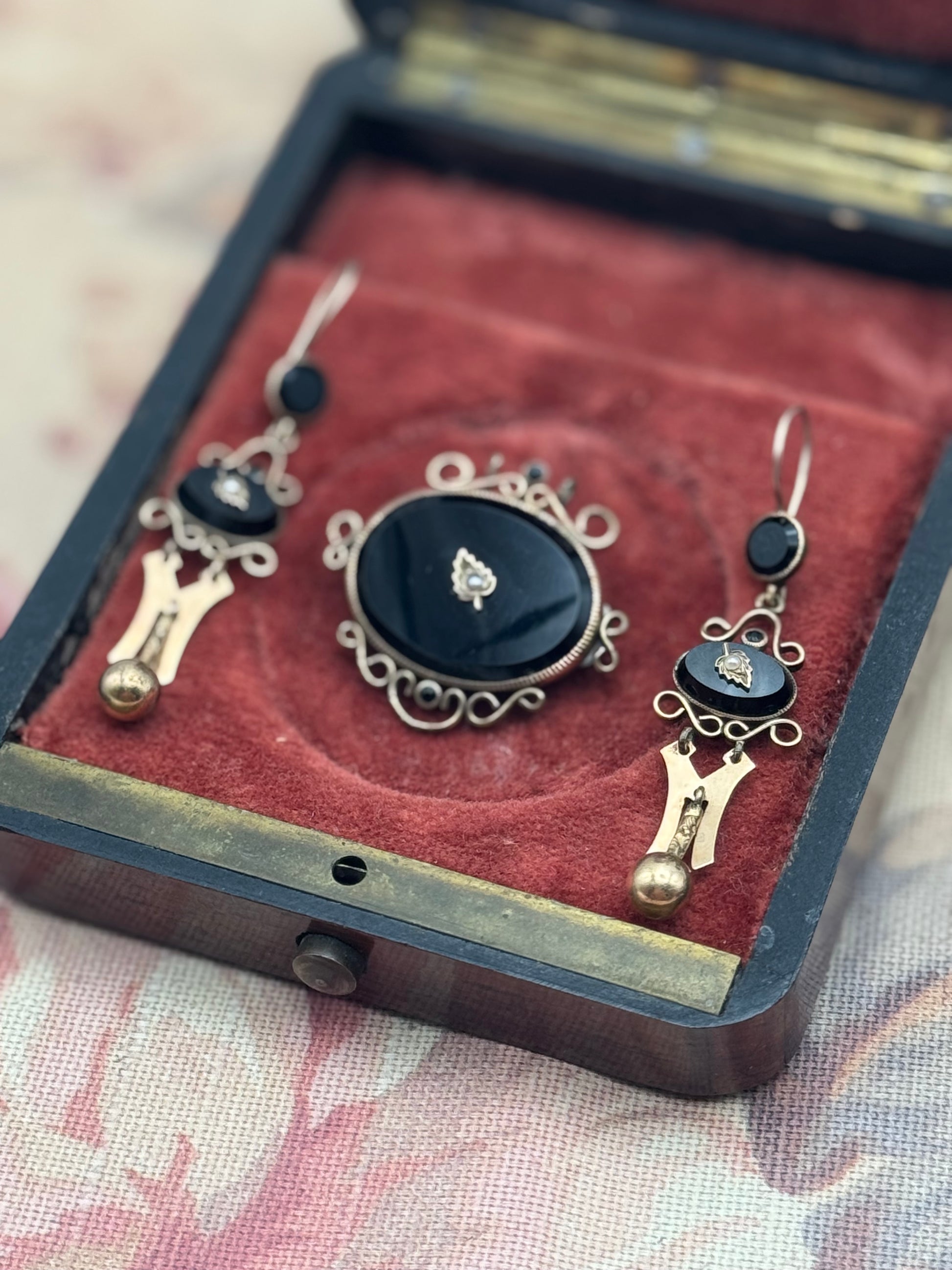 Victorian Gold-Filled Onyx & Seed Pearl Brooch & Earrings Set - Mourning