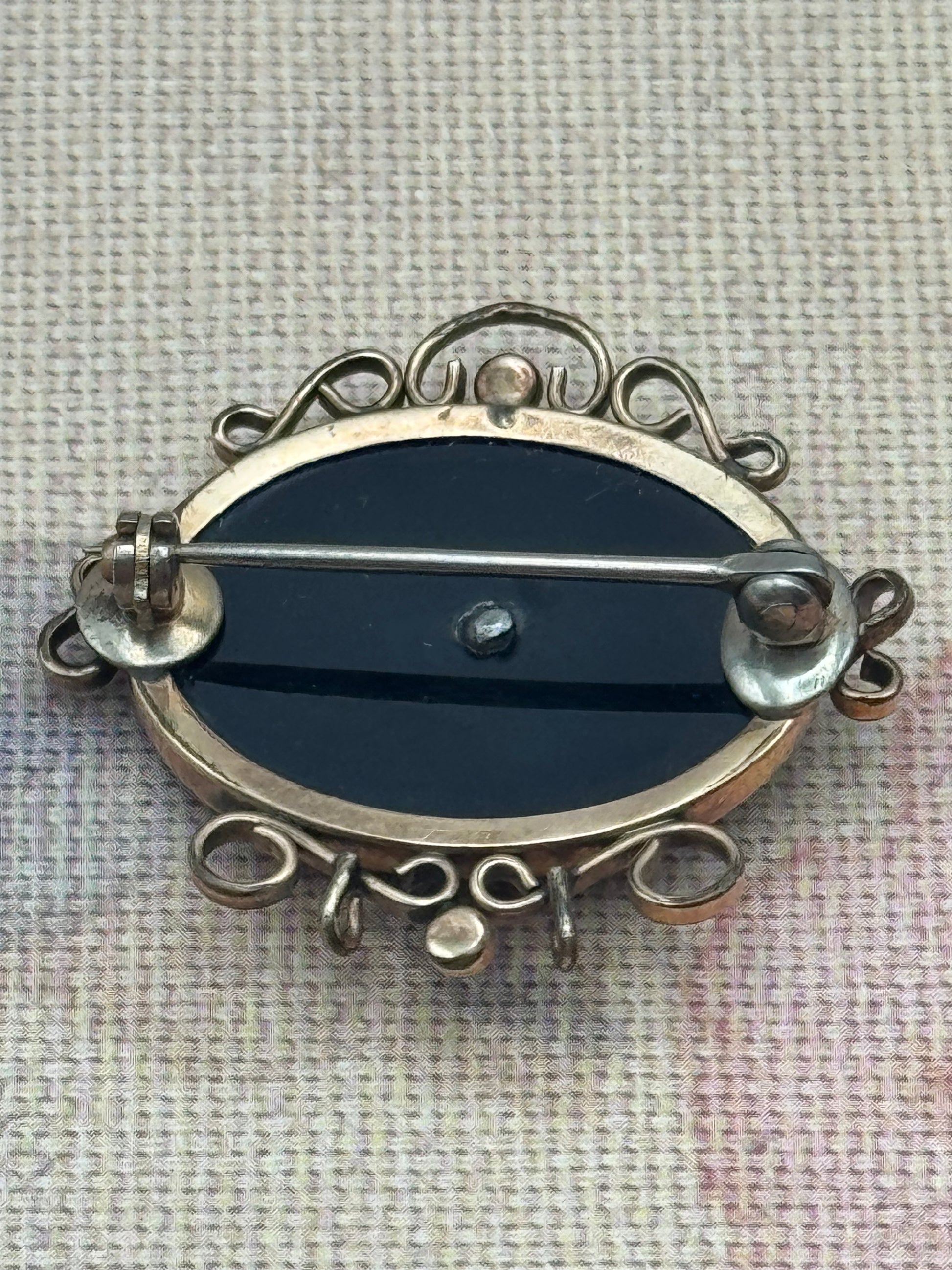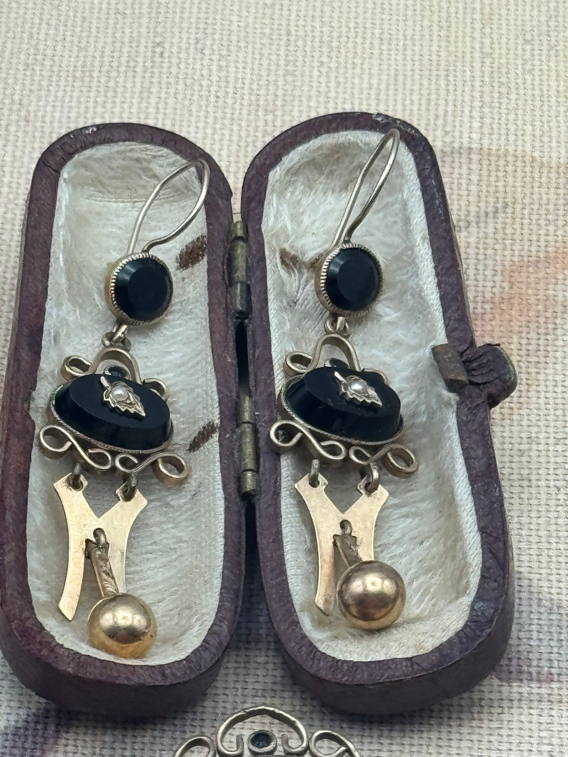 Condition: light surface wear and small age-appropriate marks to the glass and metal under magnification; seed pearls intact. Brooch clasp is a newer replacement but secure and very wearable. Overall the set presents beautifully with that inky-black Victorian glamour.