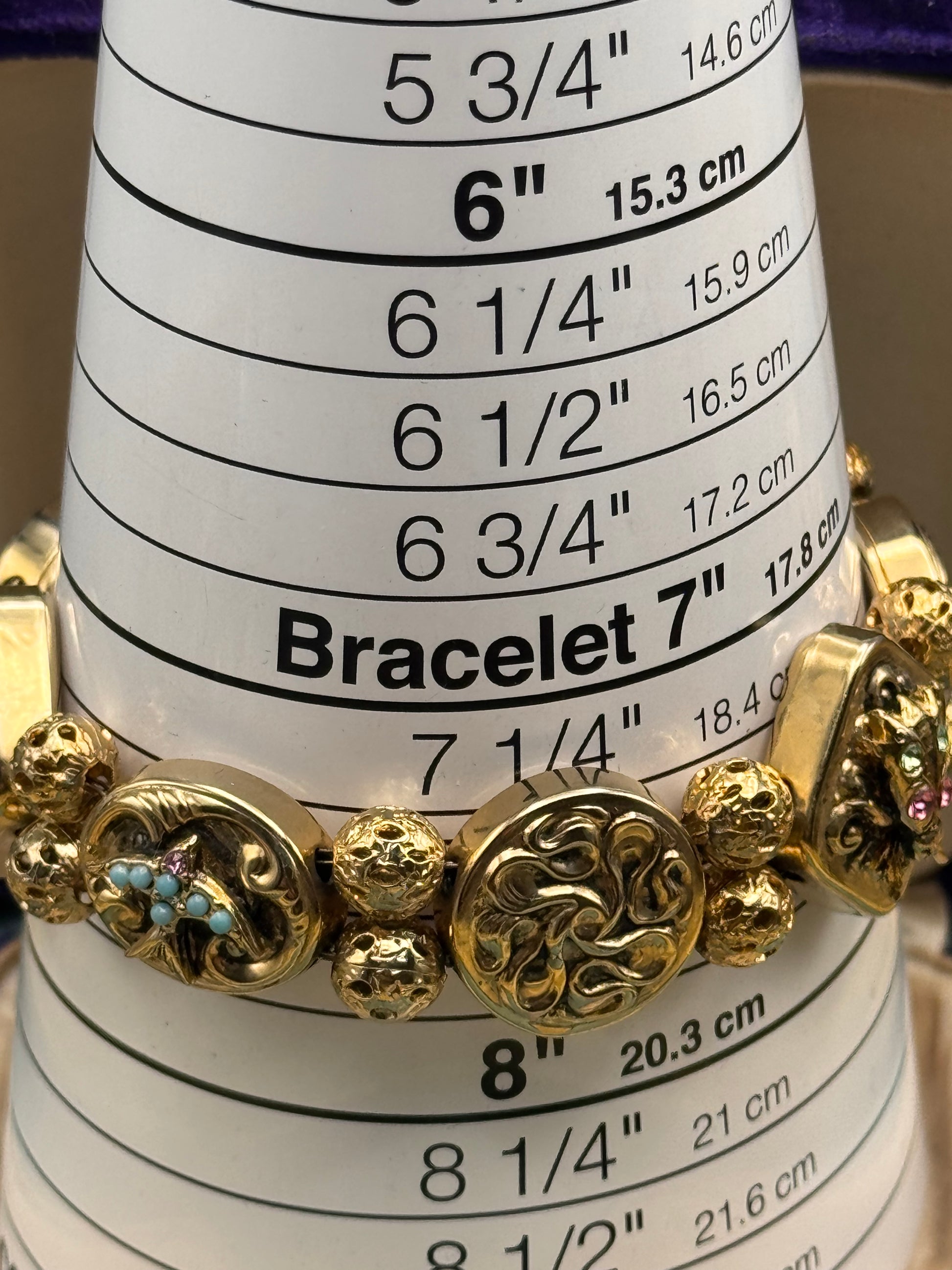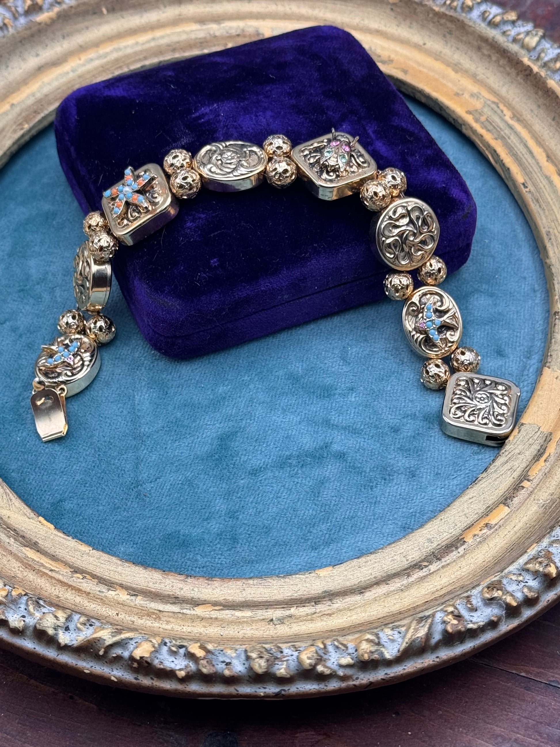 The bracelet is accented with textured bead connectors and subtle colored stones that add dimension without overwhelming the design. It has a wonderful presence on the wrist and reads as both statement and heirloom.