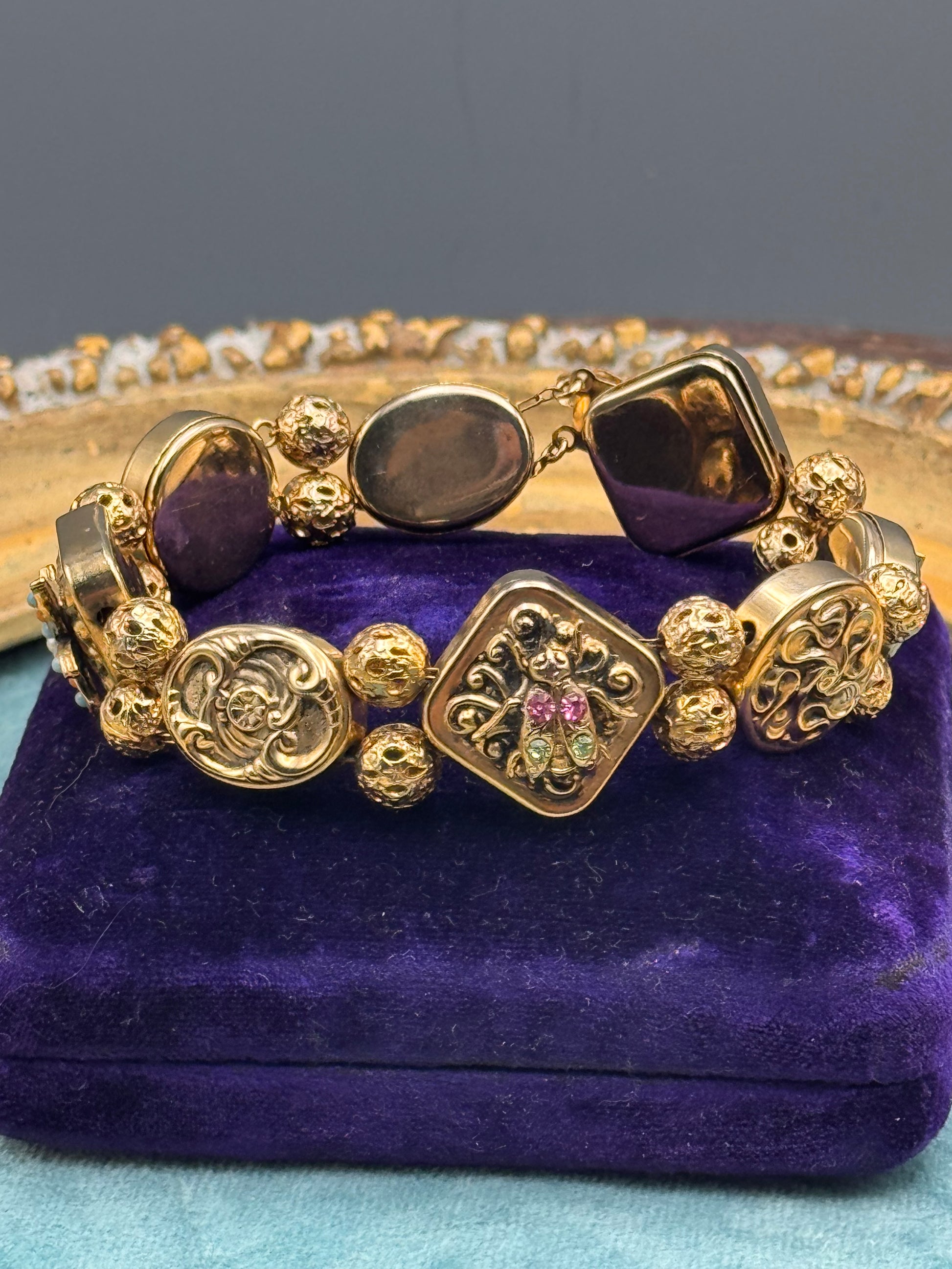 A beautifully constructed Victorian Revival slide bracelet featuring richly detailed panels that echo 19th century design. Each link presents a different motif—scrollwork, florals, and decorative repoussé—giving the piece that “collected over time” look so sought after in higher-end vintage jewelry.