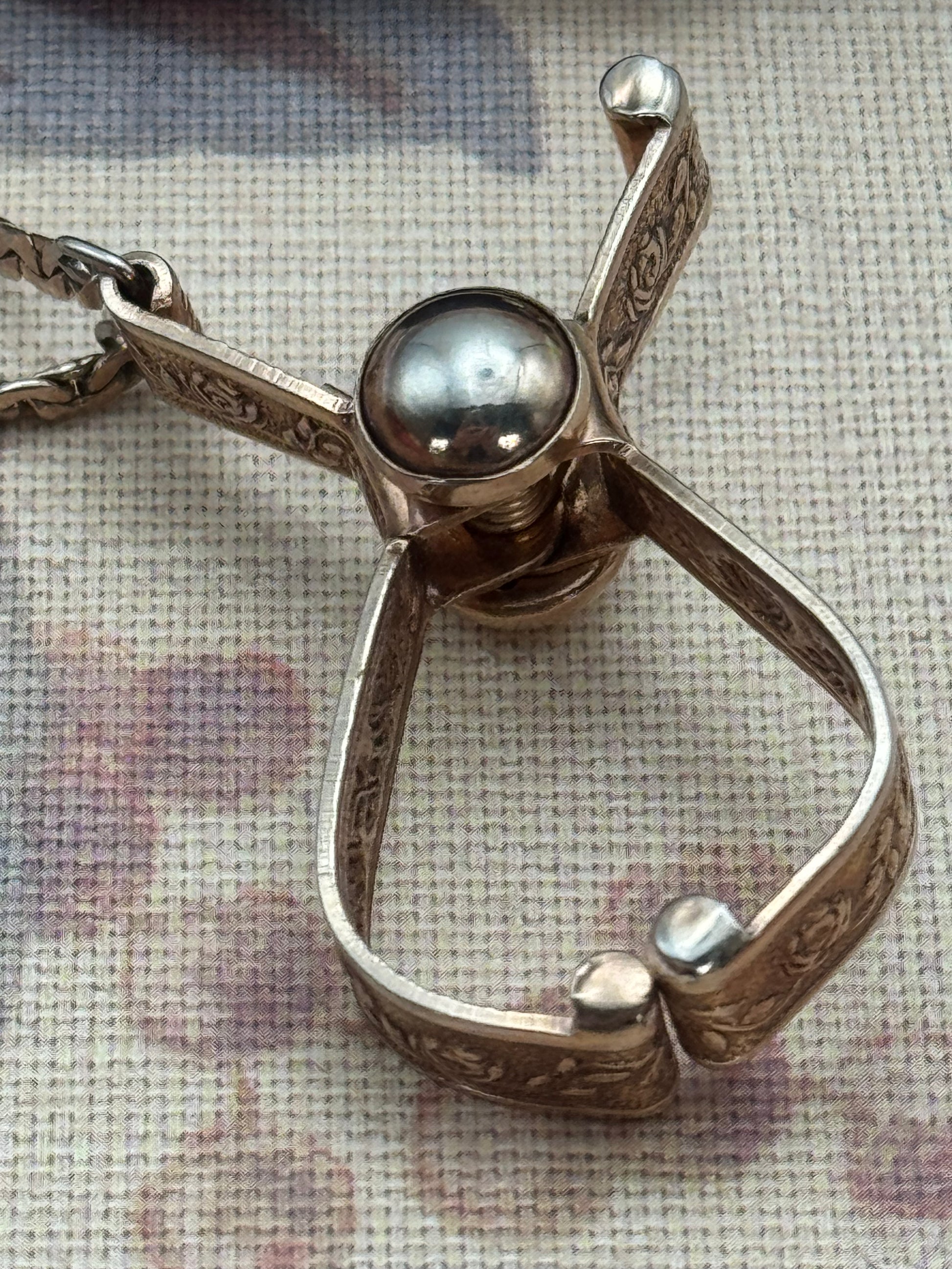 This beautiful Victorian style vintage glove holder is finished in a warm rose gold tone and decorated with intricate floral engravings along the arms. Measuring approximately 1.75” long by 1” wide, it is both elegant and functional, designed to gently hold gloves or small accessories while suspended from a chatelaine, chain, or handbag.