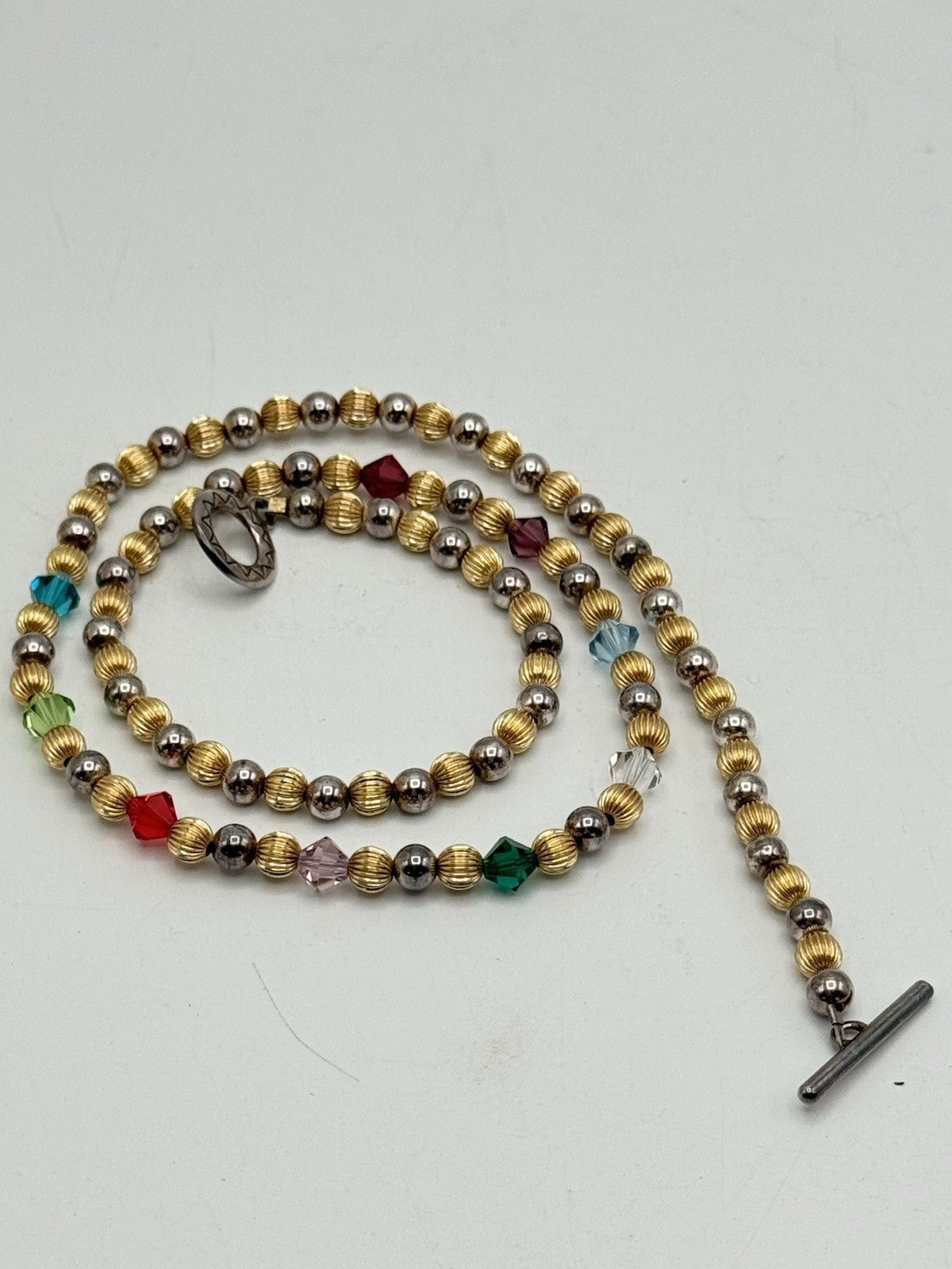 This is a vintage beaded single strand necklace made of acrylic and metal materials. The necklace is circa 20 inches long and features a multicolor design with an assortment of acrylic and metal beads. Gold and silver tones accented with red, green, purple, and other accent beads.