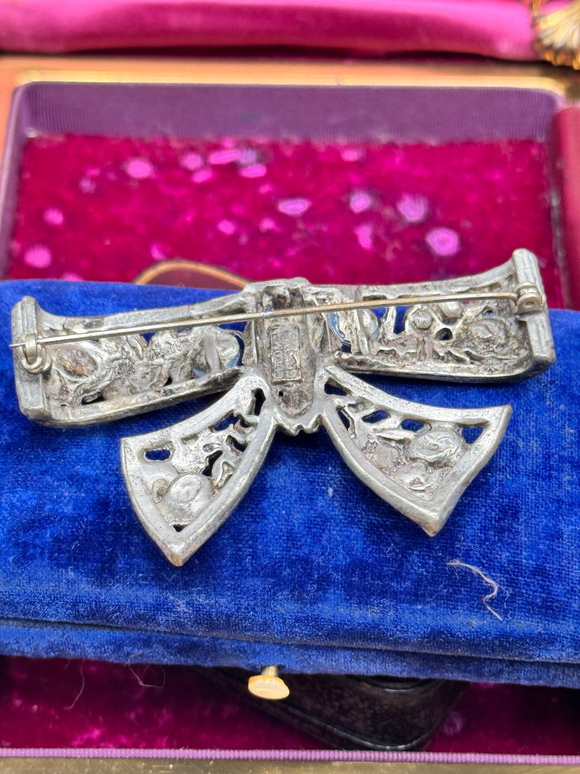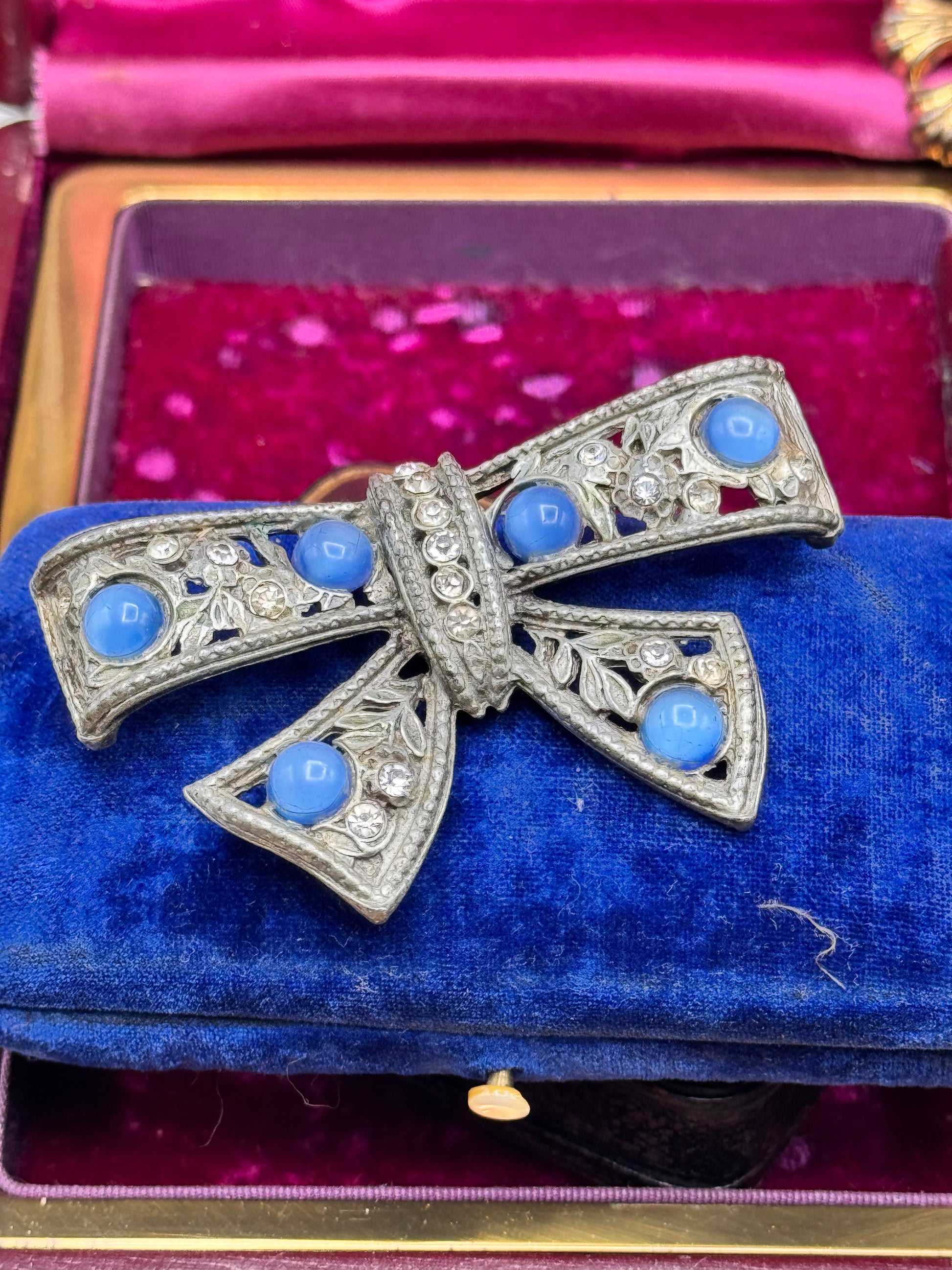 A striking vintage bow brooch signed Goldman, beautifully designed with vivid sky-blue cabochons accented by clear rhinestones in an intricate silver tone setting. The openwork floral and foliate detailing gives this piece wonderful dimensional depth and classic mid-century glamour.