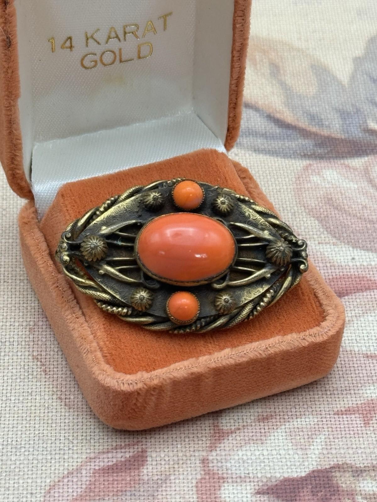 Vintage 1930s brass brooch set with vibrant faux coral glass cabochons. The ornate floral and rope motif frame highlights a large oval cabochon at center, accented by two smaller matching stones in striking orange-red tones.