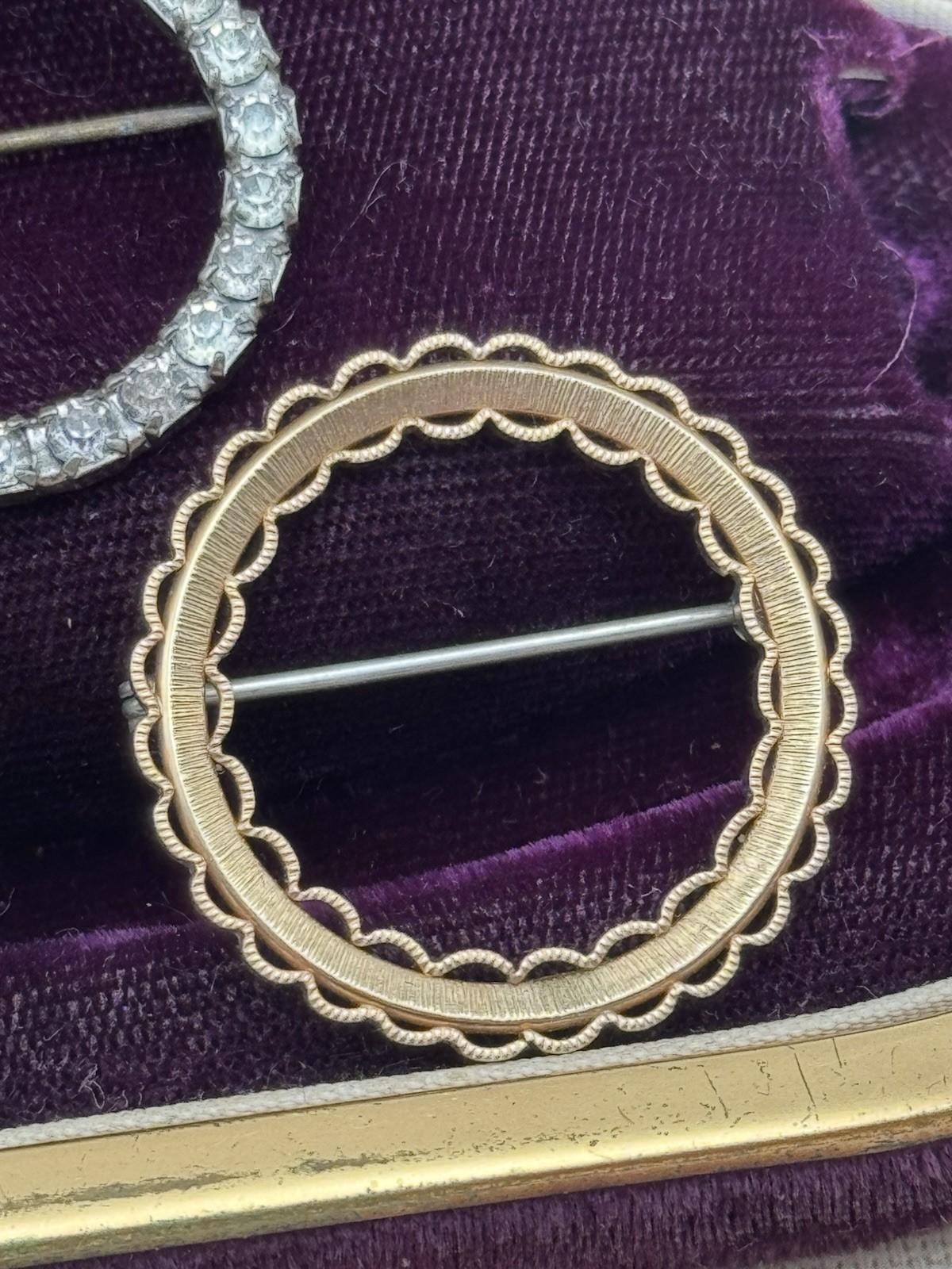 Charming set of three vintage circle brooches, each with its own unique design. These versatile pins can be worn individually, layered together, or used as accents on jackets, scarves, or hats.