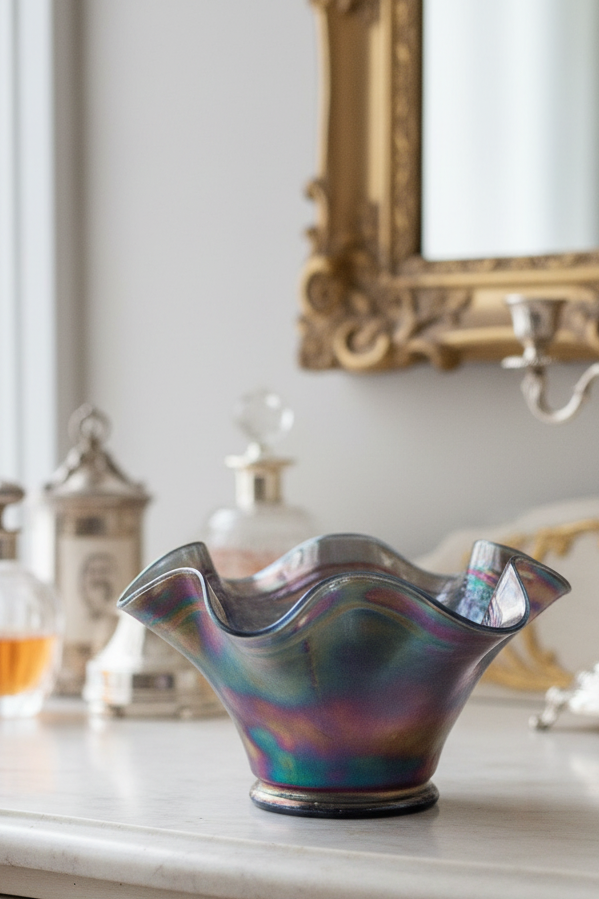 This striking vintage carnival glass bowl comes from a lifelong private collection and displays the rich jewel-tone iridescence that made Fenton glass so beloved in the early 20th century. Featuring the classic Blackberry pattern with deeply molded fruit and leaf details, this ruffled bowl glows with cobalt blue, violet, and oil-slick highlights that shift beautifully in the light.