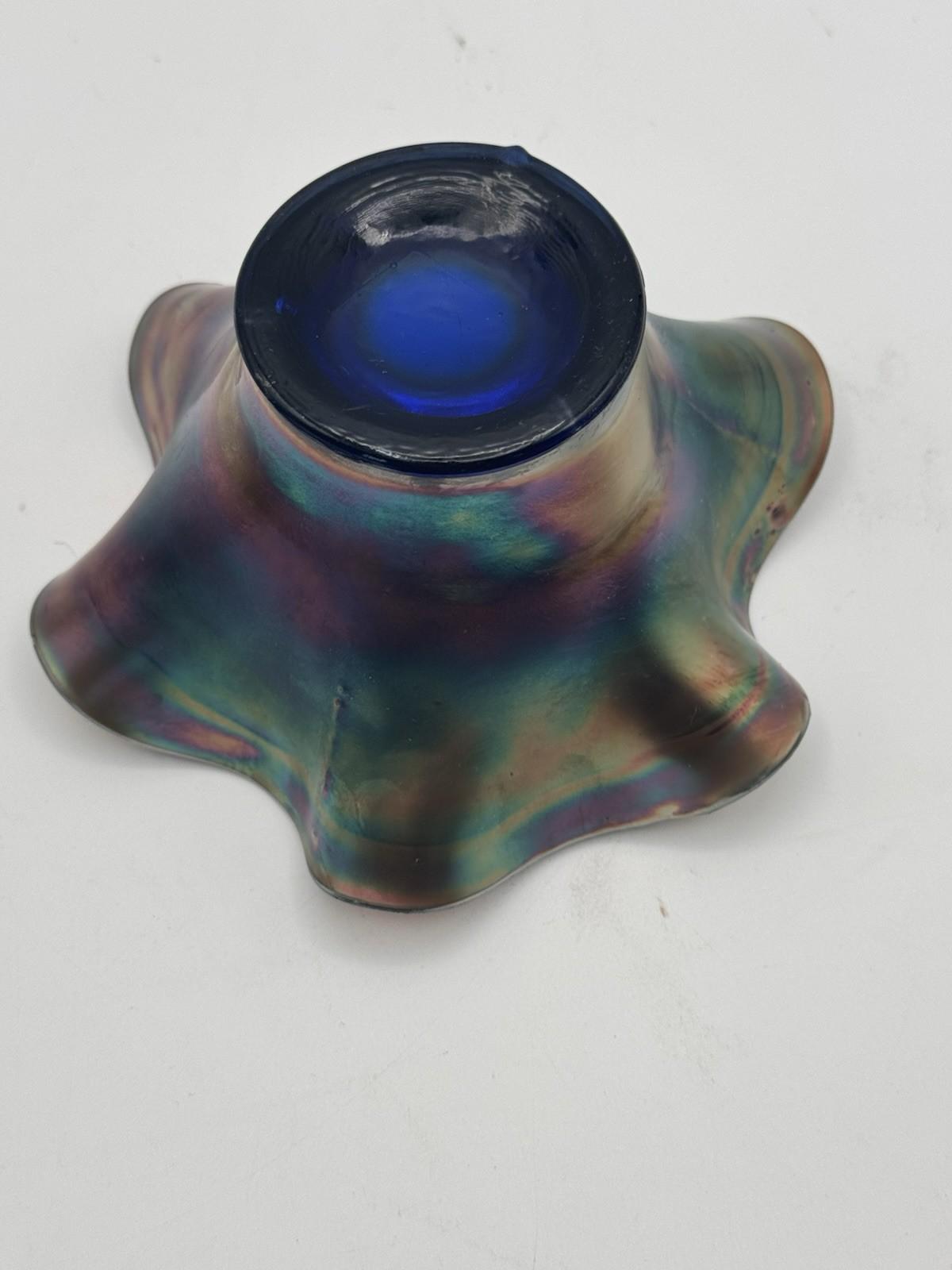 Based on pattern, color, and form, this piece is attributed to Fenton to the best of our research and knowledge. The deep cobalt blue base with strong carnival iridescence makes this a particularly desirable and elegant example for collectors and for those who love Old Money style interiors.