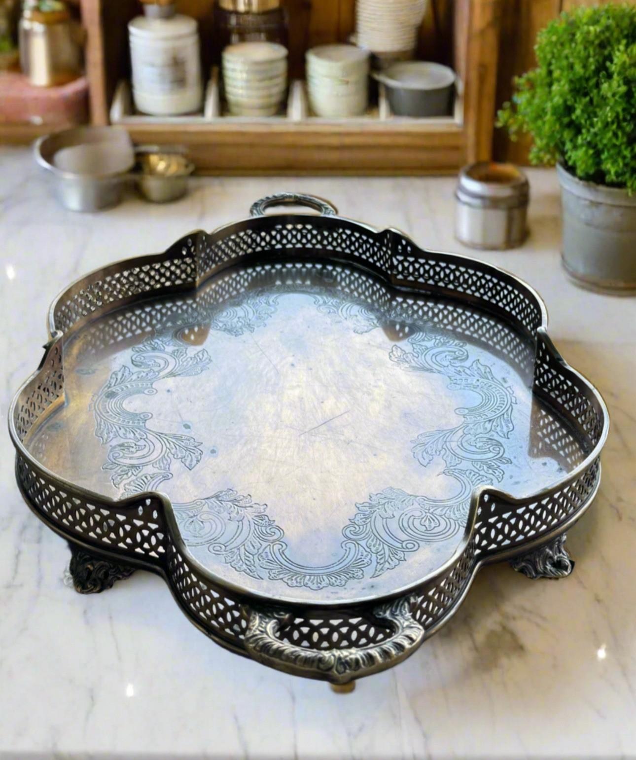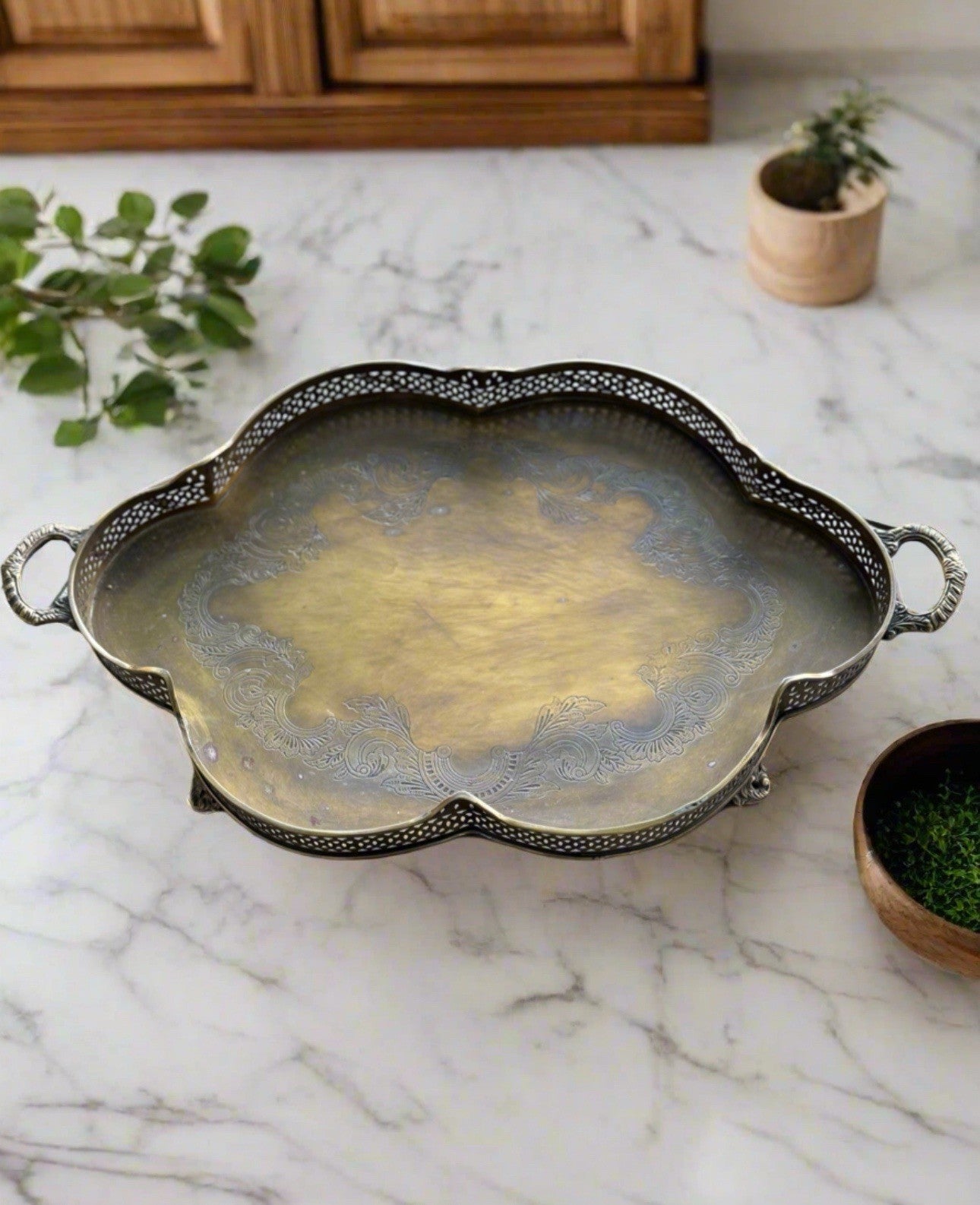 A striking vintage solid brass gallery tray, crafted with a scalloped outline, pierced gallery sides, ornate cast handles, and decorative feet. The tray features finely engraved scrollwork on the surface and has developed a rich, aged patina with spotting that enhances its authentic vintage appeal.