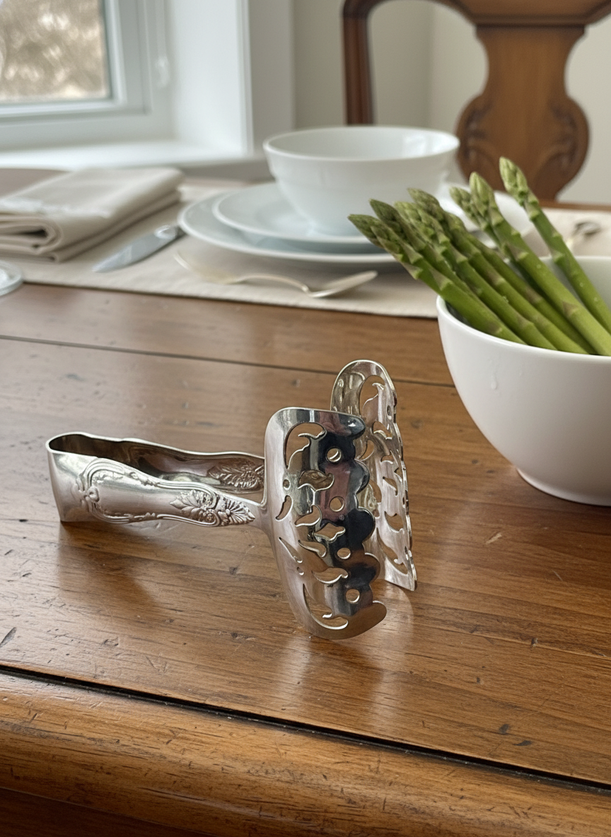 Godinger silver plate serving tongs, inspired by the classic Tiffany asparagus tongs. This elegant reproduction features wide pierced blades with scrolling foliage and engraved handles, giving it that refined Old World look at a much more accessible price point. Perfect for serving asparagus, pastries, cookies, or tea sandwiches on a holiday or everyday table.