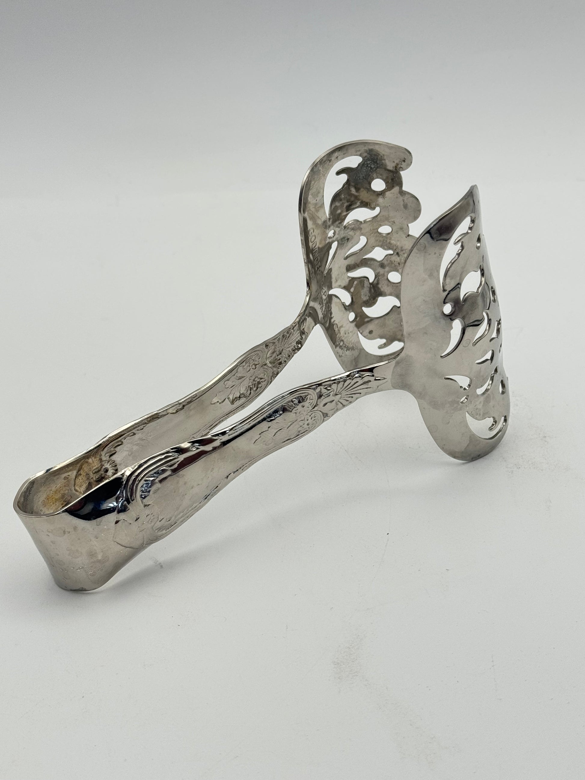 Marked Godinger. Silver plate with light age-appropriate surface wear, including some small water spots and polishing marks visible on close inspection. No bends, breaks, or repairs; hinge works smoothly and grips well. Please review all photos as they are part of the description.
