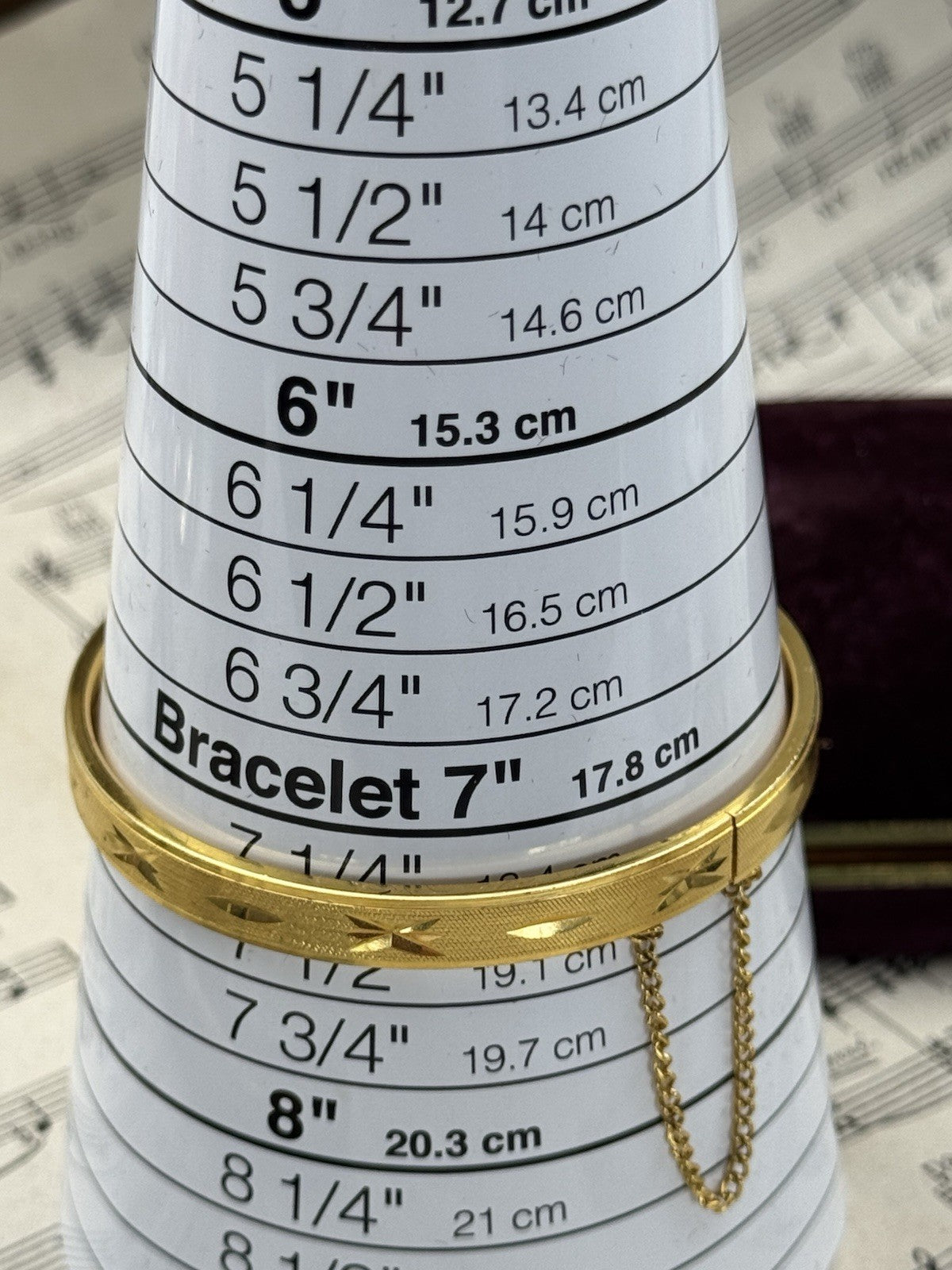 Vintage Goldtone Hinged Bangle Bracelet Geometric Design 7”+ SAFETY