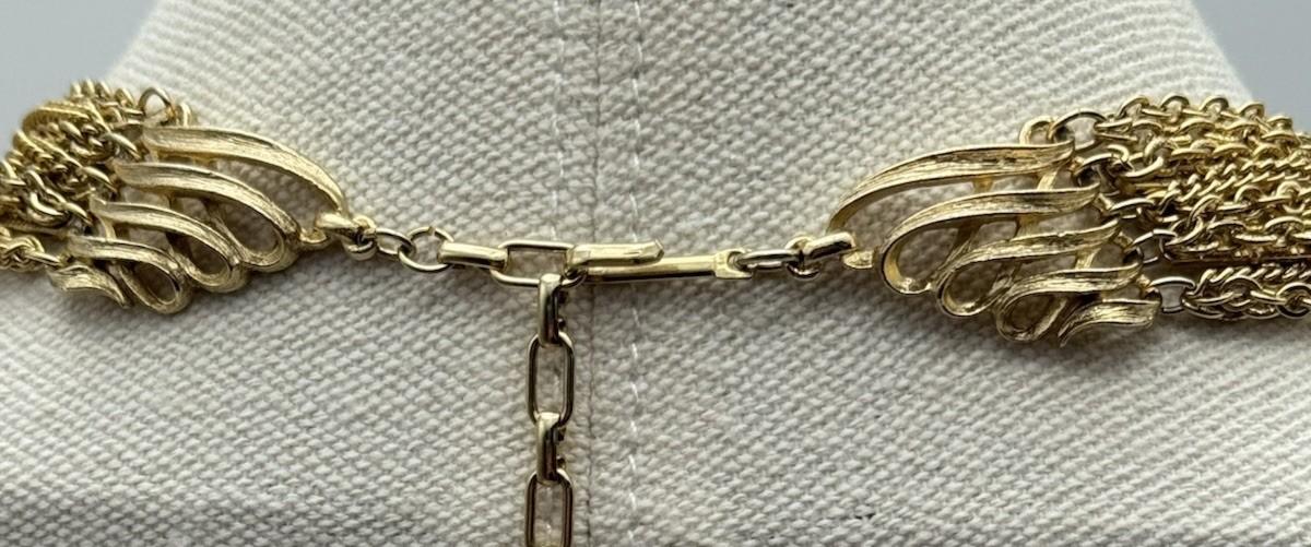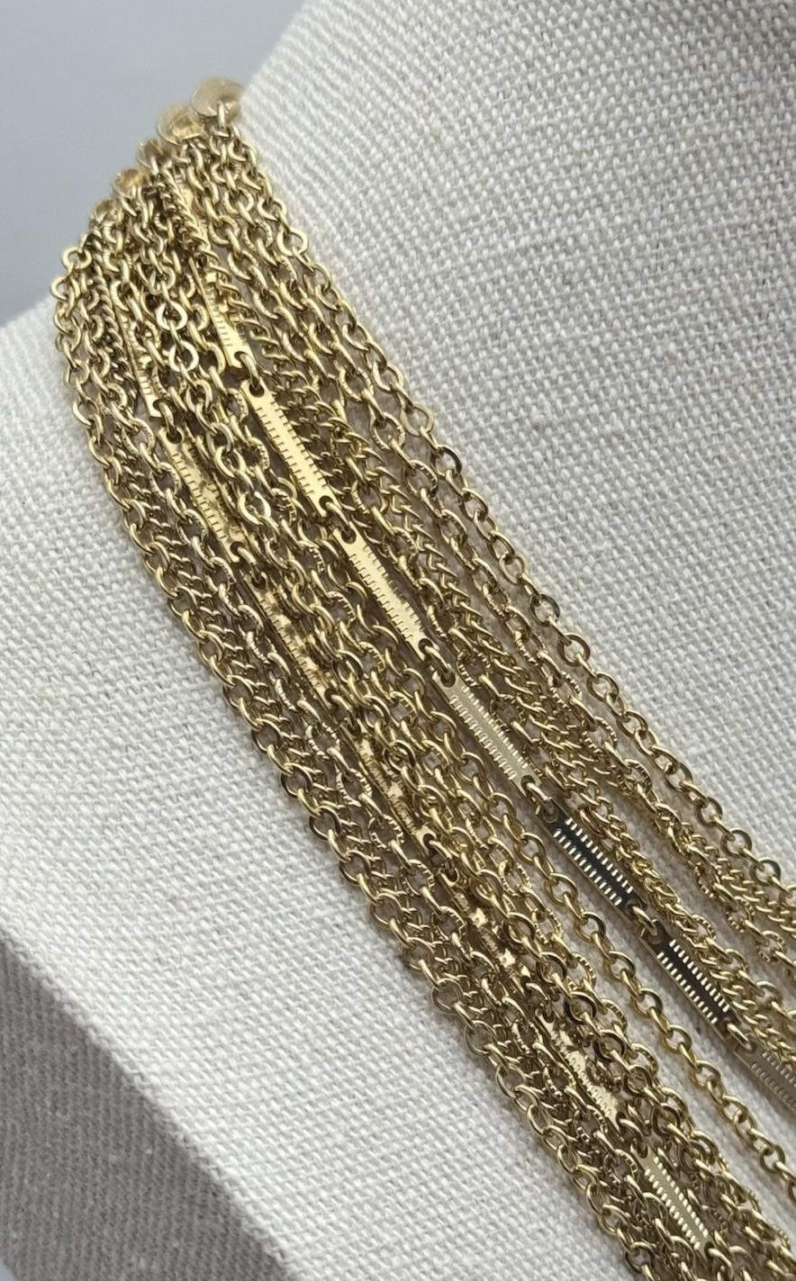 This striking vintage statement necklace features multiple cascading gold-tone chains in a layered bib style. The design creates a bold, elegant drape with a drop depth of 3.5 inches, adding movement and texture. At its longest, the necklace measures 18 inches with an adjustable extender chain and secure hook clasp, allowing for a customized fit.