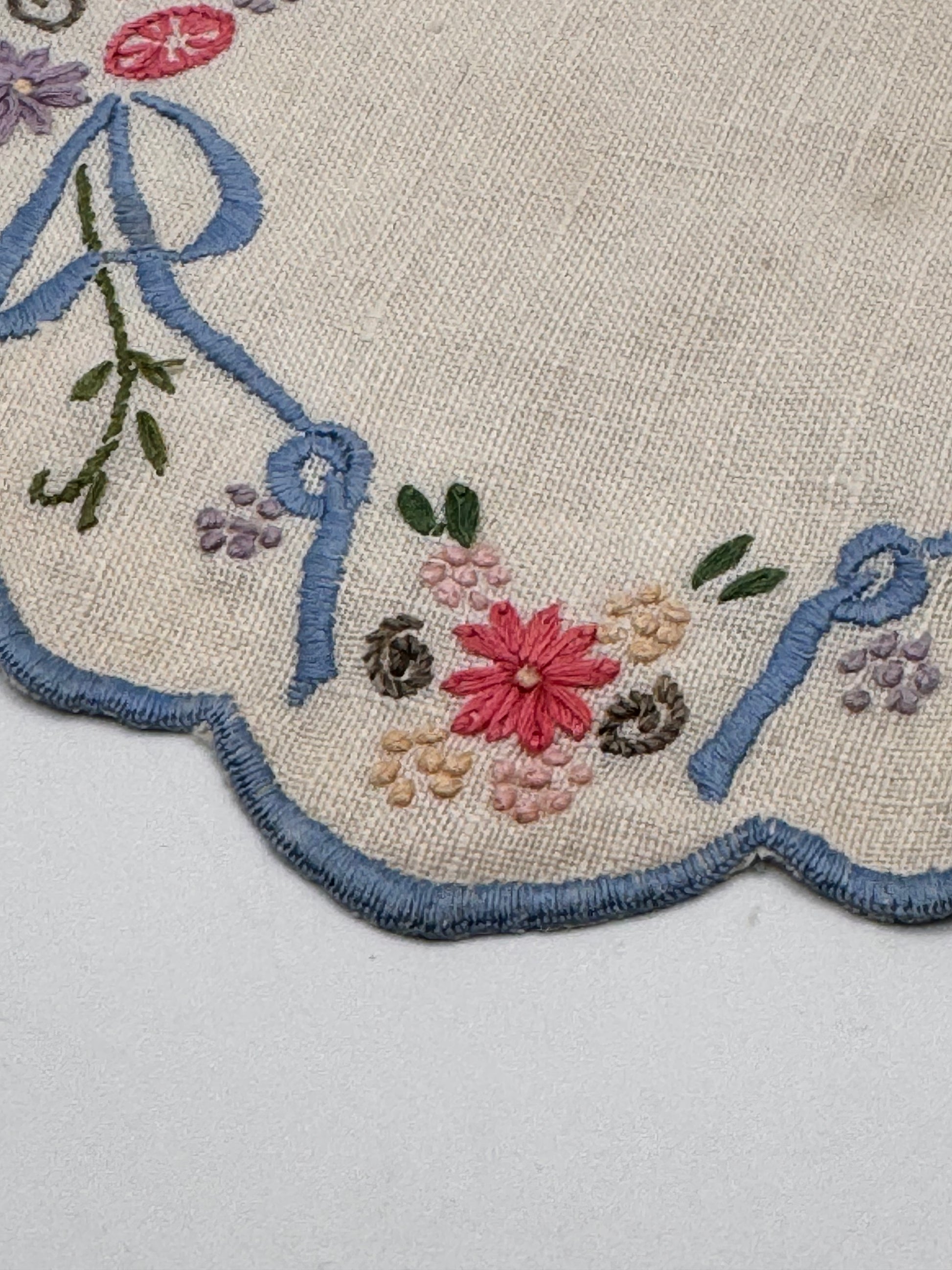 This lovely vintage doily is entirely handmade and features delicate hand embroidery on natural linen. The design showcases soft floral motifs in pastel shades of pink, lavender, soft red, green, and buttery yellow, accented by charming blue ribbon bows. A gently scalloped edge finished in blue embroidery frames the piece beautifully, giving it a romantic, cottage-style feel.