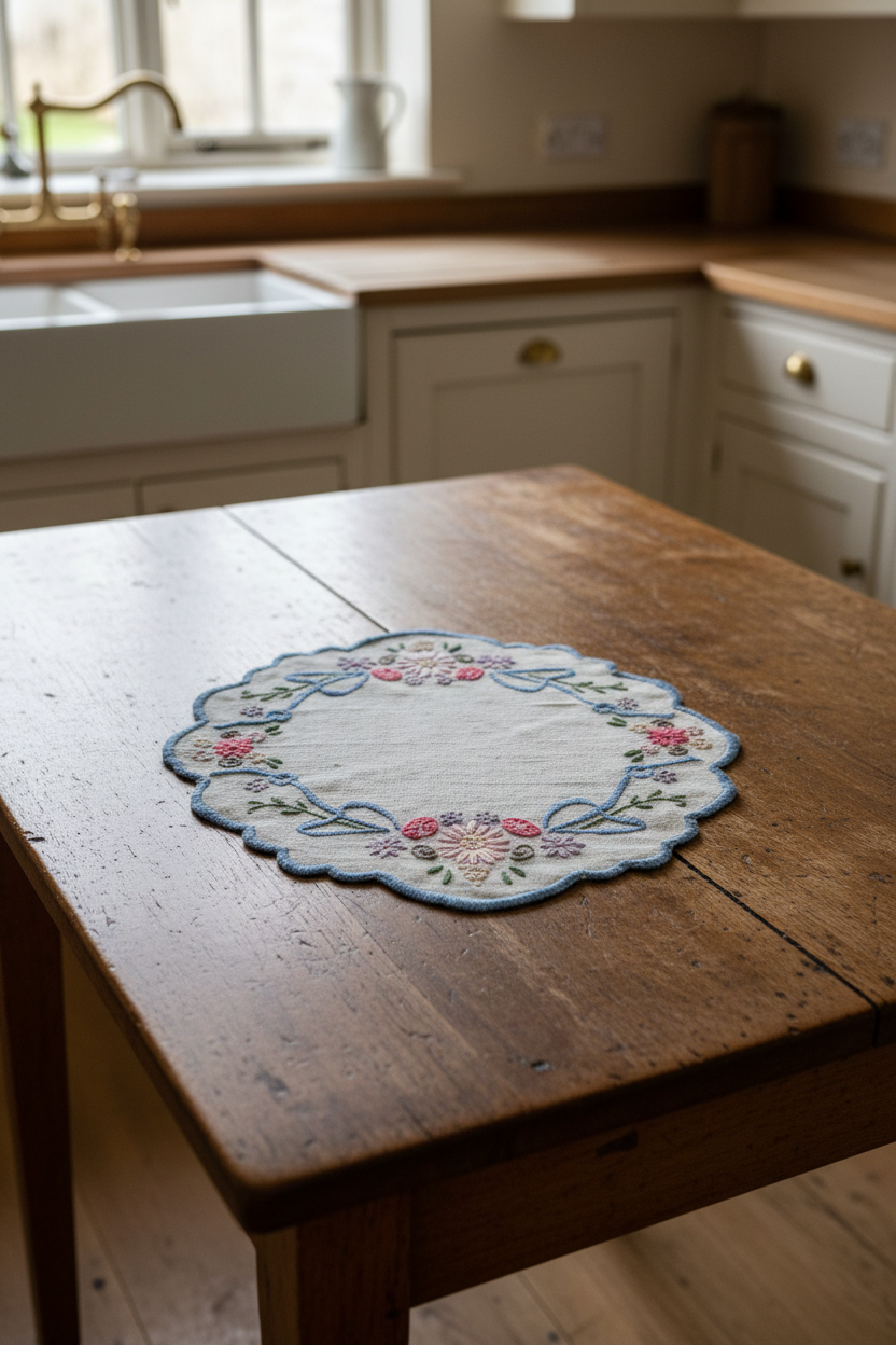 Beautiful beneath a small lamp, vase, compote, or centerpiece. Lovely on a dresser, side table, or layered into a linen collection. Complements cottagecore, romantic, French country, and Old World-inspired interiors.