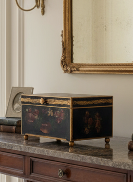 The black backdrop color and hand-painted details add to its vintage charm, making it a lovely decorative collectible for any space. Crafted from wood, this box is not only functional but also adds a touch of nostalgia to any home decor.