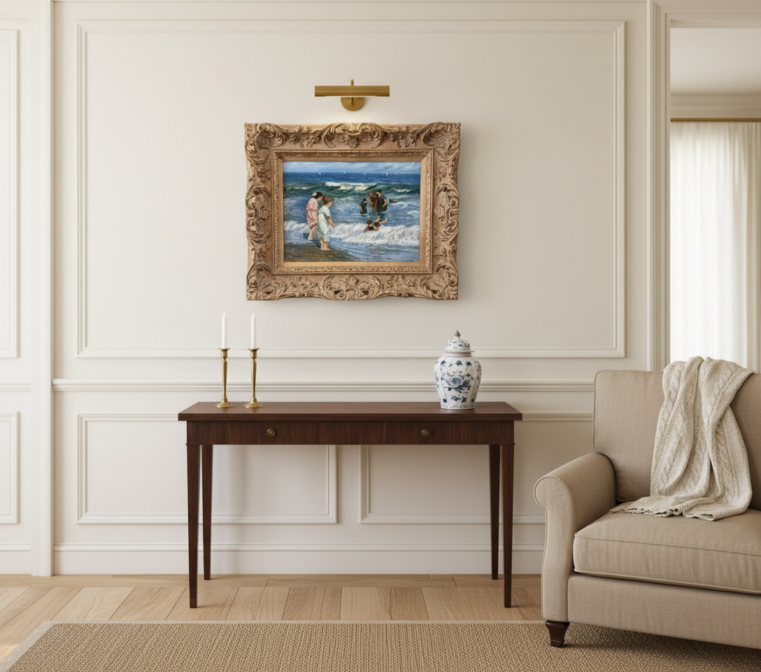 This vintage impressionist beach scene oil painting on canvas features a charming seascape captured in a medium size wood frame measuring 23.5 x 19.5 x 3 inches. The painting it self is circa 16 x12”. Signed by the artist, this original impressionist work exudes a nautical theme with natural elements typical of the seaside. The beach scene, painted with an oil painting technique, portrays a group of young children at the sea reminiscent of the early 20th century, making it a beautiful addition to any art collection or beach-themed decor. Condition Is in good age appropriate condition. May show some age appropriate wear. Please review all photos to form your own opinion. Dimensions Please see photos.