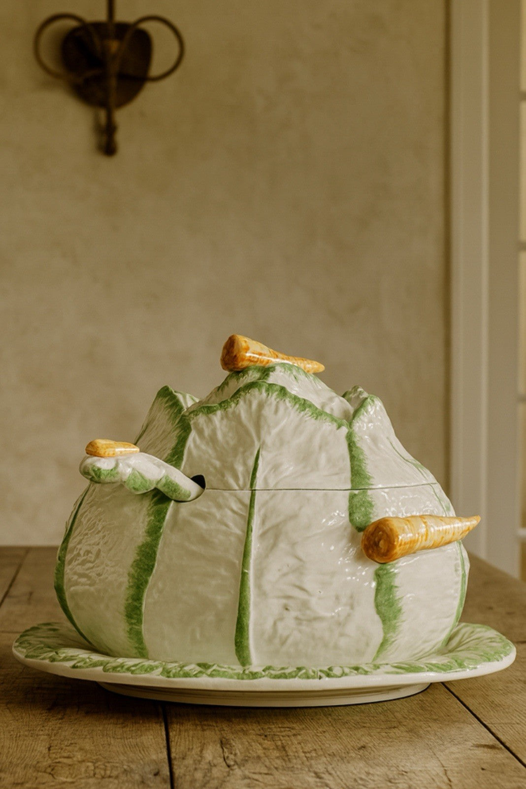 This complete Carraro cabbage and carrot tureen set is a true rarity, rarely found with its platter, lid, and ladle intact. With its large scale and whimsical trompe-l’oeil design, it is perfect for display in a French country kitchen, farmhouse dining room, or Provence-inspired interior. Both elegant and playful, it’s a must-have for collectors of majolica and vintage Italian ceramics.