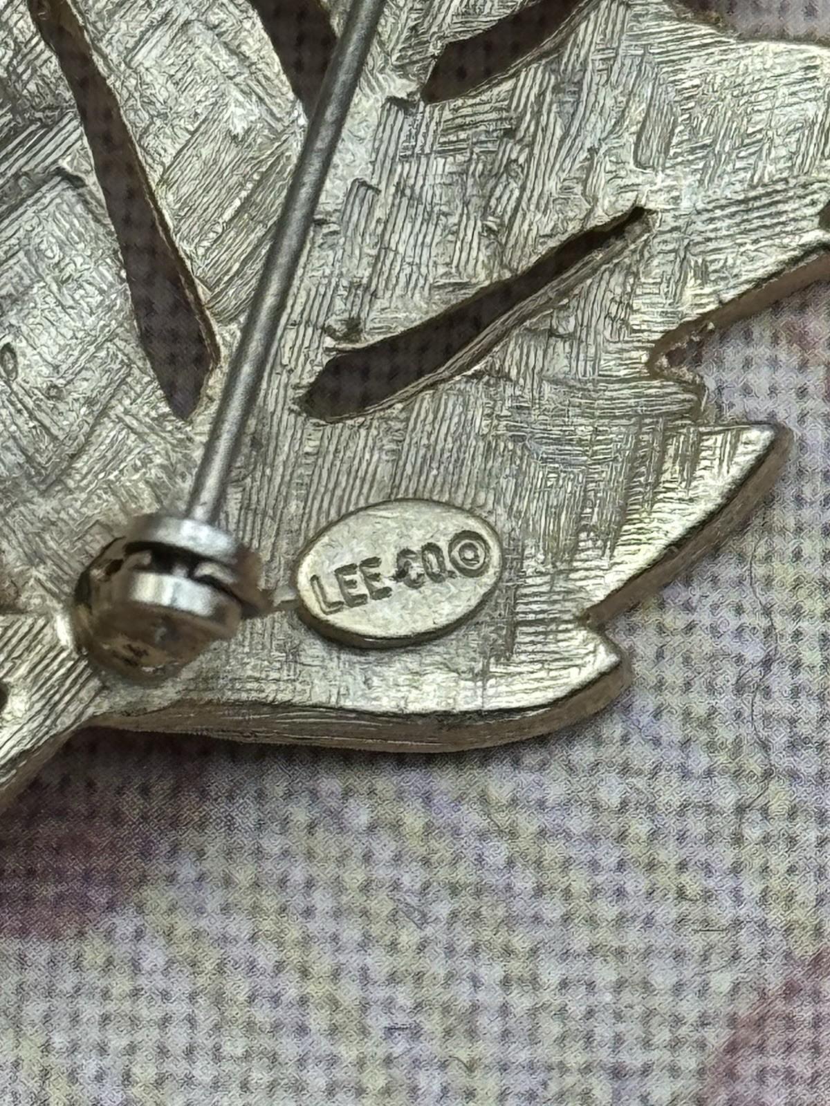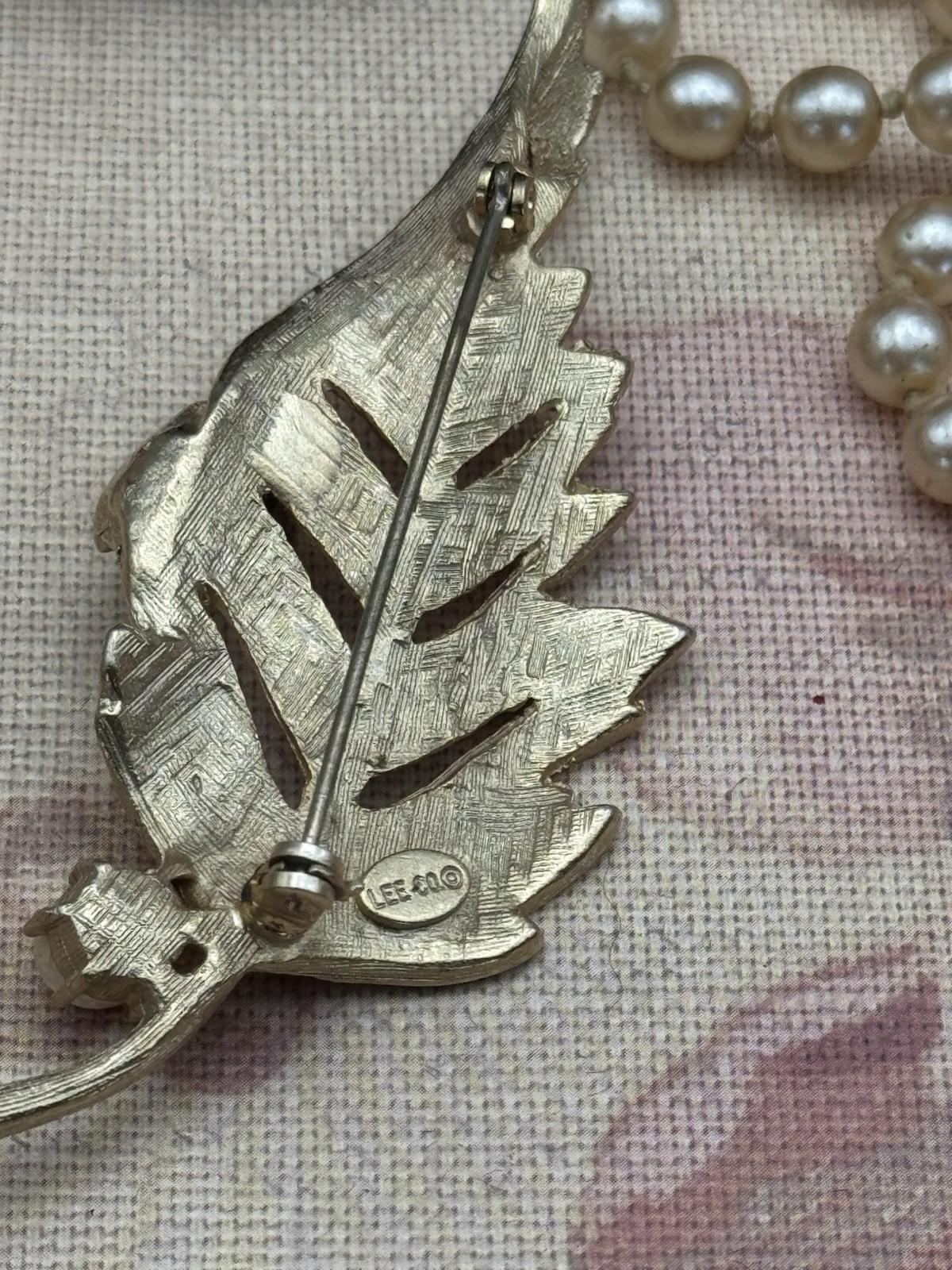 Lee Co brooches are sought after for their bold leaf motifs and classic faux pearl accents. With the necklace showing light age wear and the brooch in solid condition, this set is well-suited for collectors and stylish wearers alike.