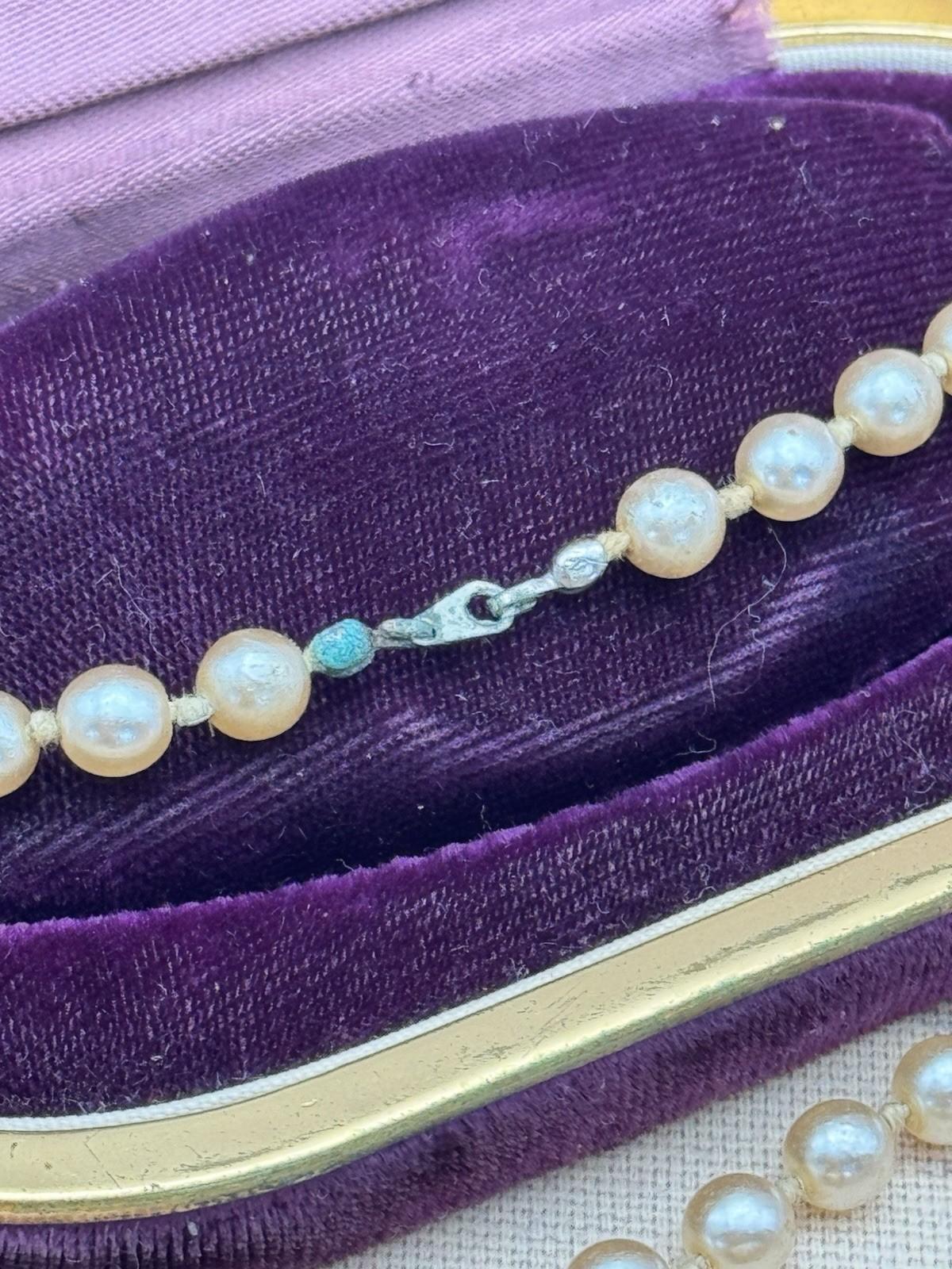 The necklace measures approximately 26 inches long, with beads about 0.25 inches wide. It has a fixed clasp that does not open and shows age-related patina. The beads display gentle wear consistent with age.