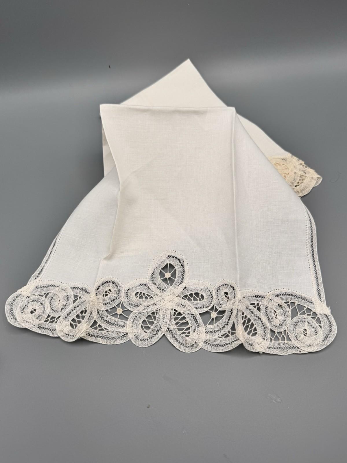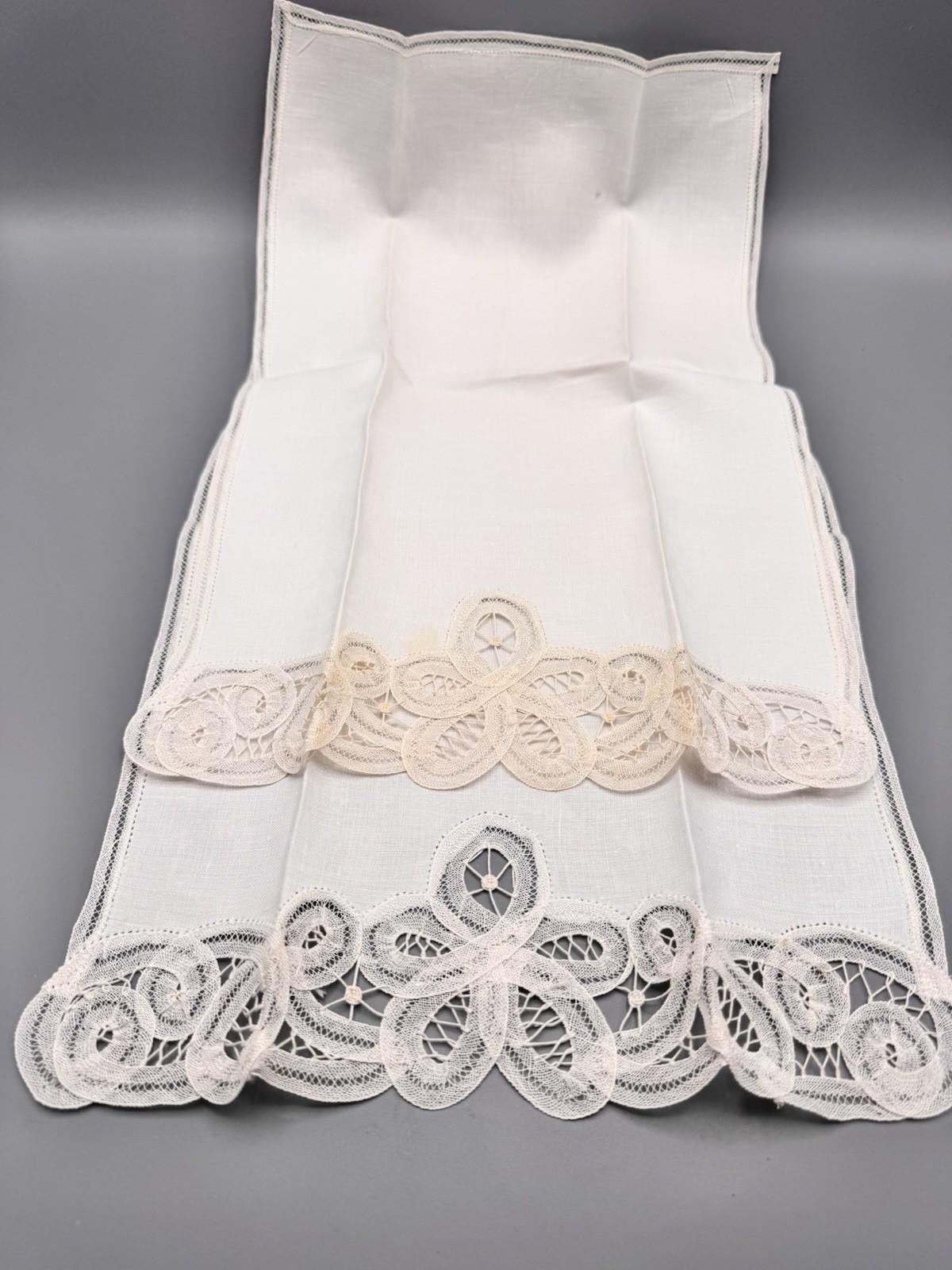 A refined pair of vintage handmade linen hand towels featuring intricate lace appliqué trim and delicate drawn threadwork borders. The lace work is dimensional and highly detailed, with looping scroll motifs and openwork medallion centers — far more substantial than standard trim.