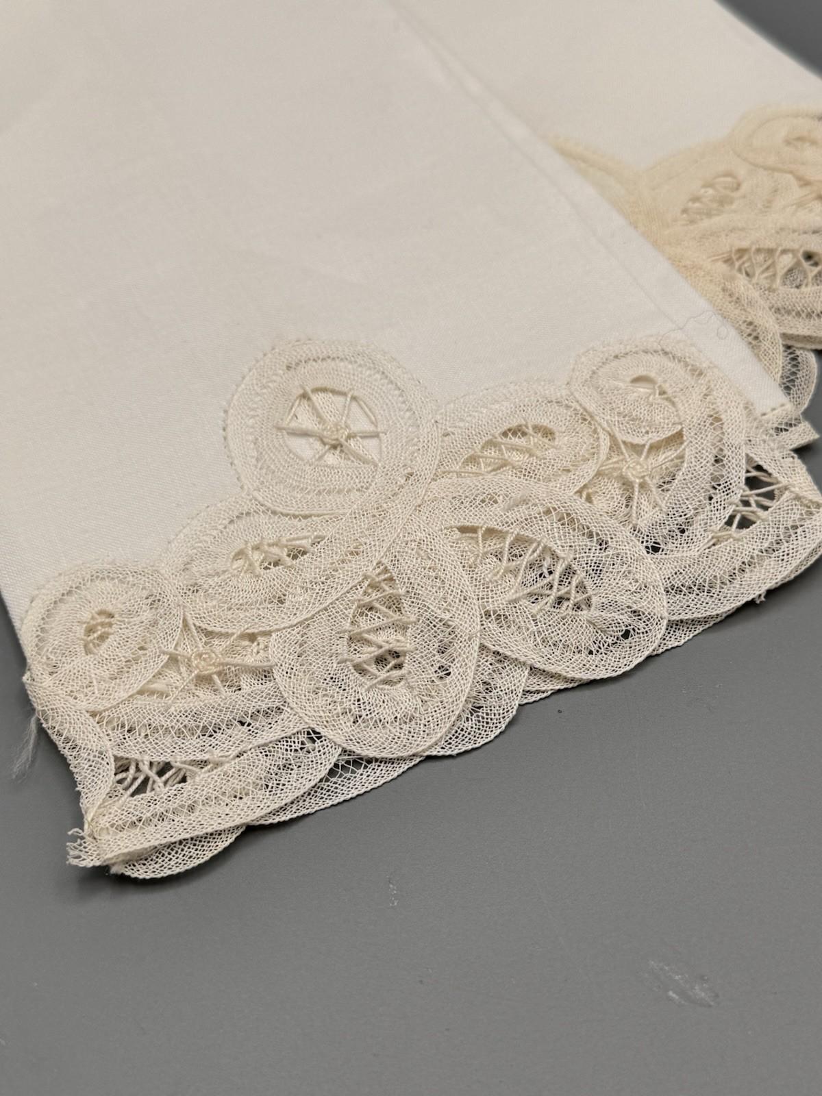 Vintage condition with age toning to the lace and one light visible stain (shown in photographs). Linen body remains strong and intact. No major tears noted. Please review all photos carefully as they are part of the description.