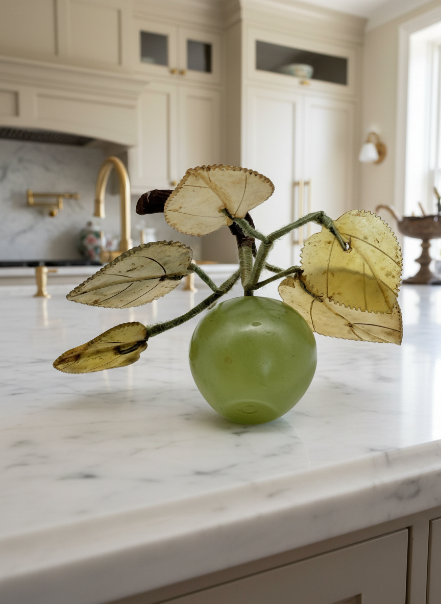 This vintage MCM carved jade alabaster stone small apple is a beautiful decorative piece for any home. The intricate details of the pear-shaped apple are sure to catch the eye of anyone who sees it. The green color of the apple adds a touch of natural beauty to any room.