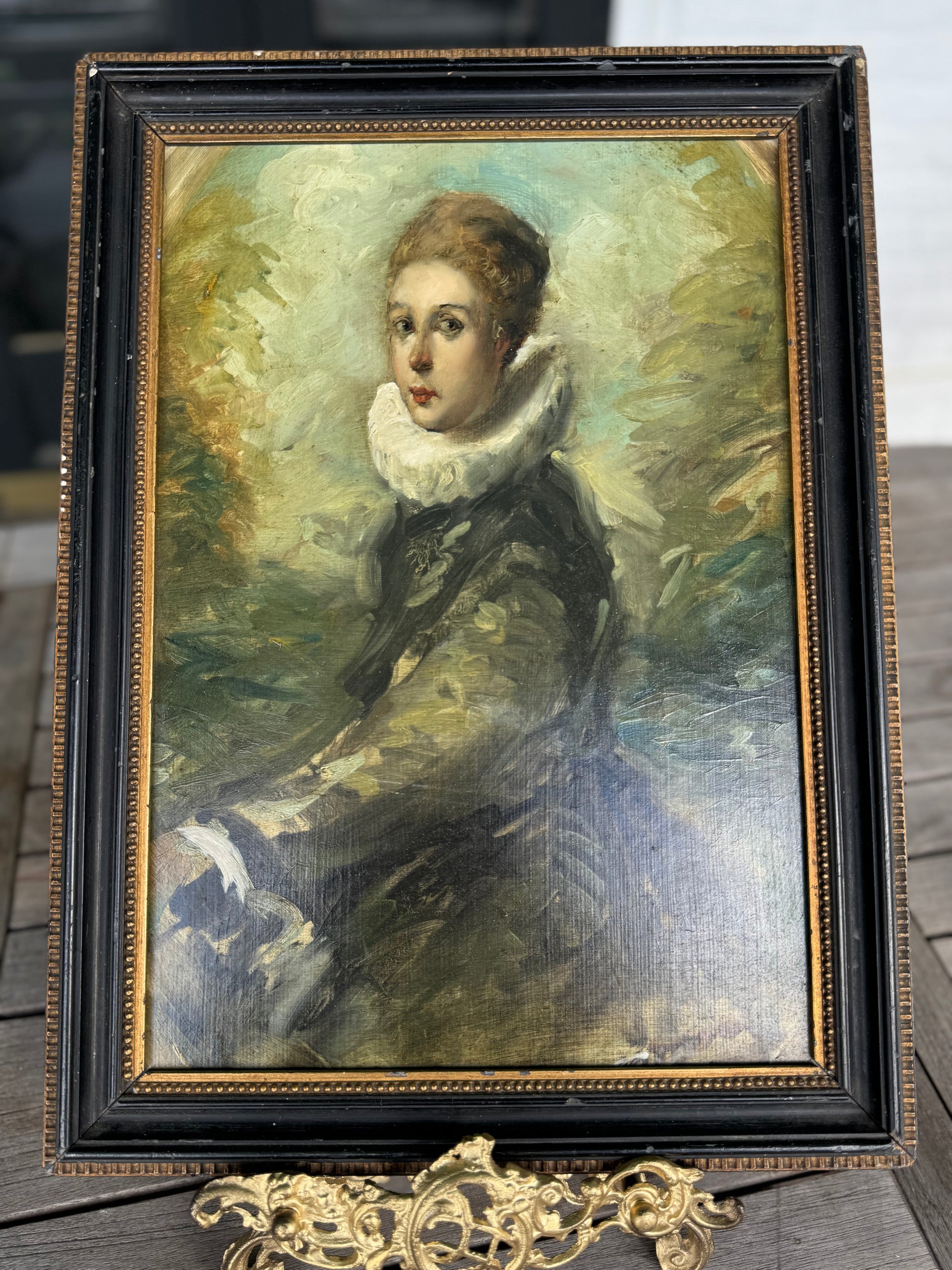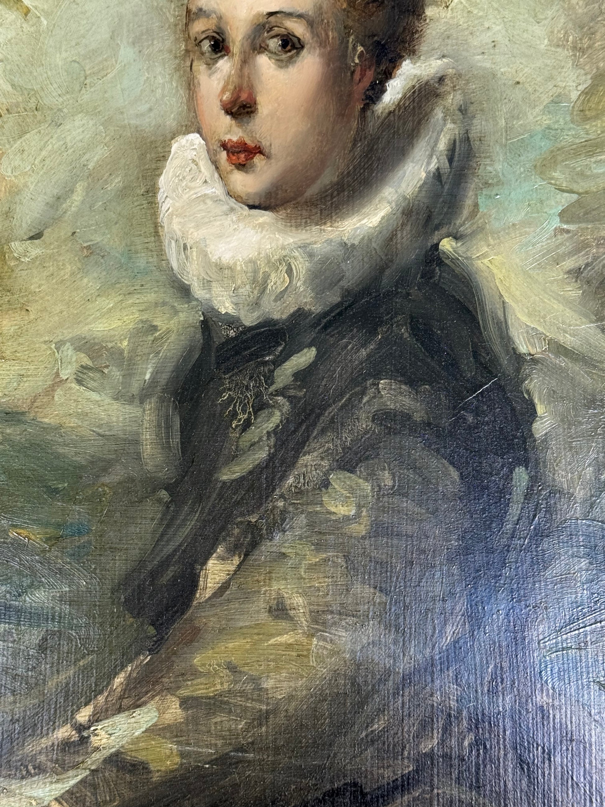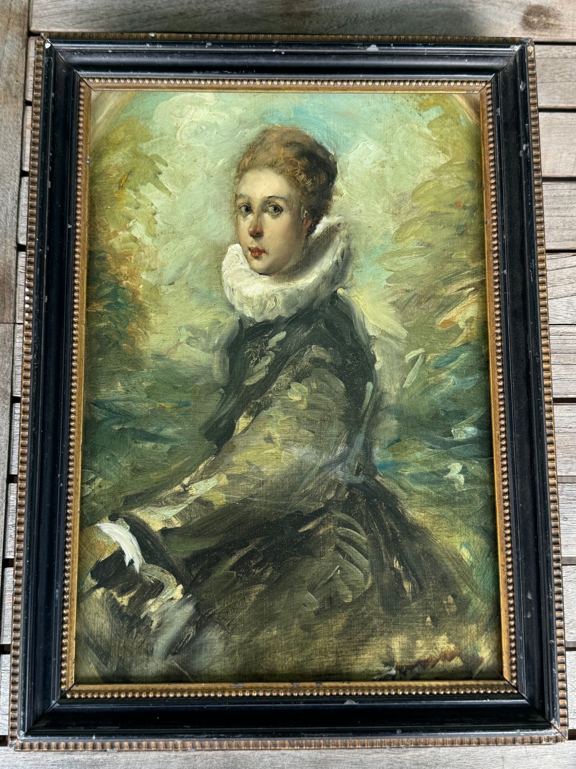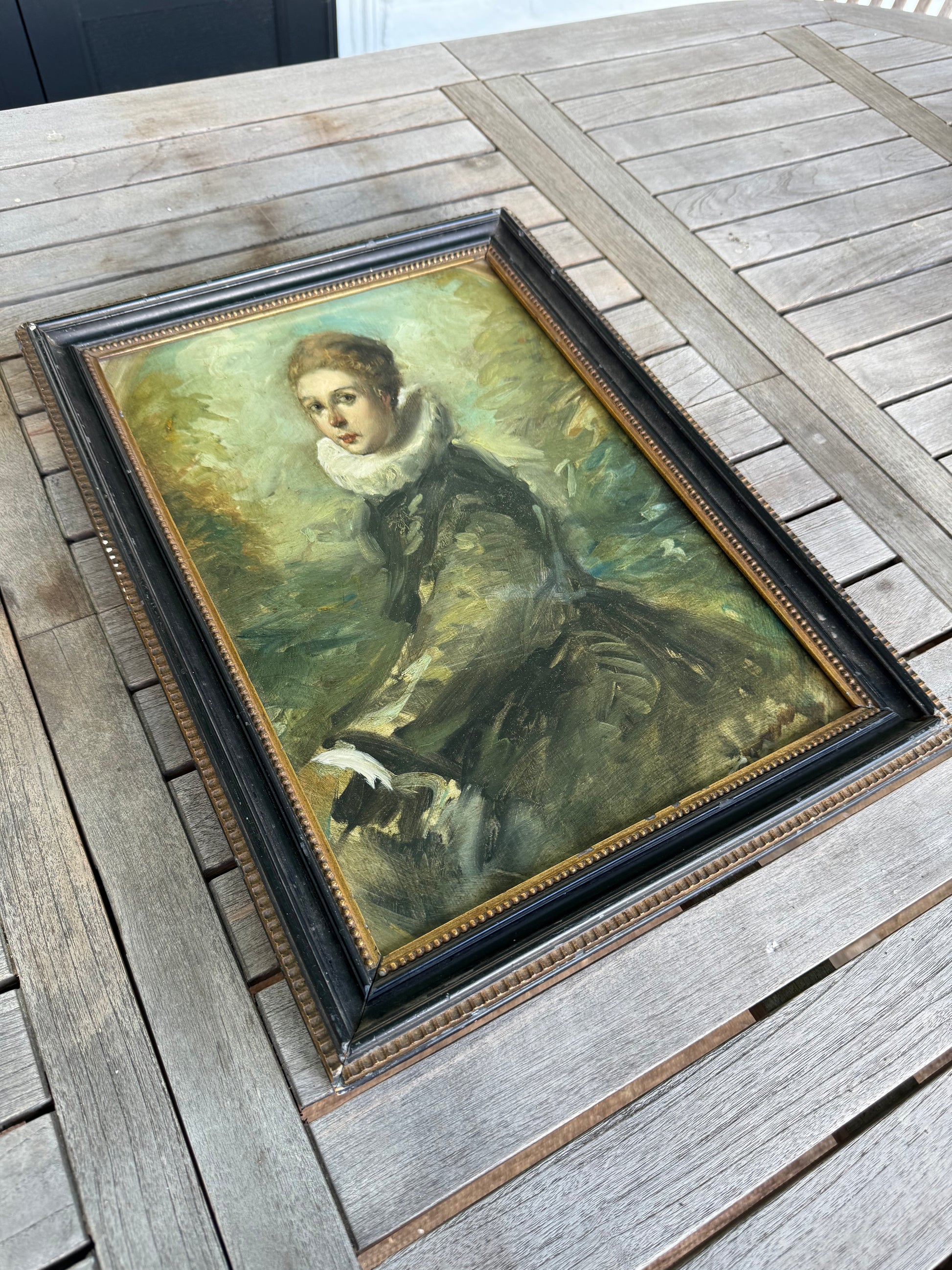 This is a vintage circa 1930s oil painting on board framed Elizabethan subject portrait in a somewhat impressionist style.