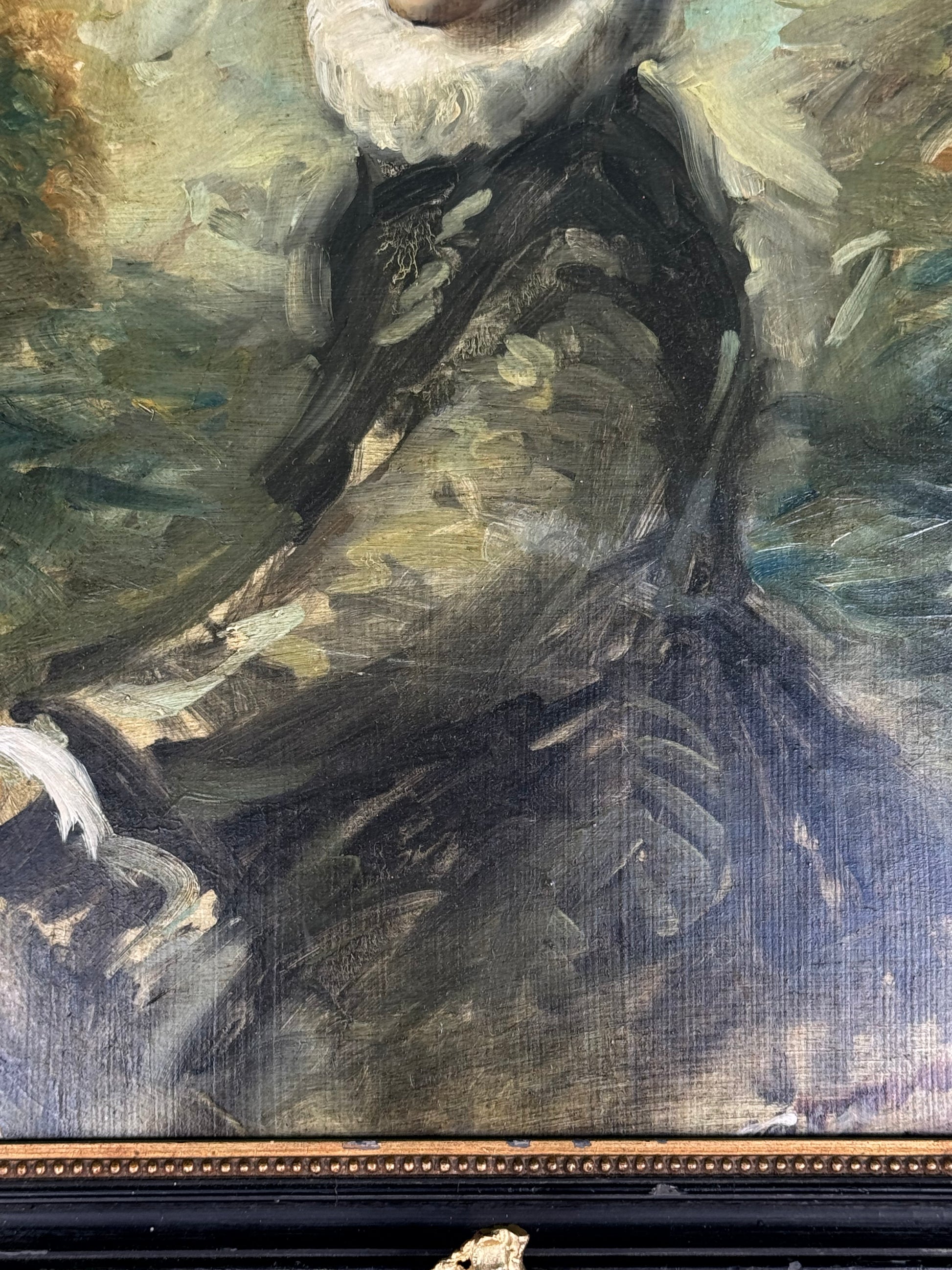 The oil painting technique adds depth and richness to the portrait, making it a valuable addition to any art collection or a lovely decorative piece for a historical or vintage-themed space.