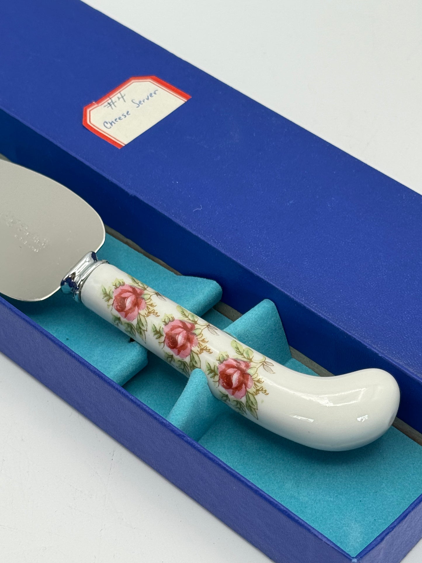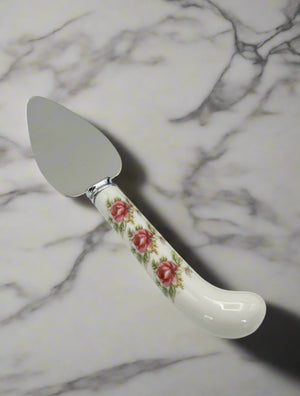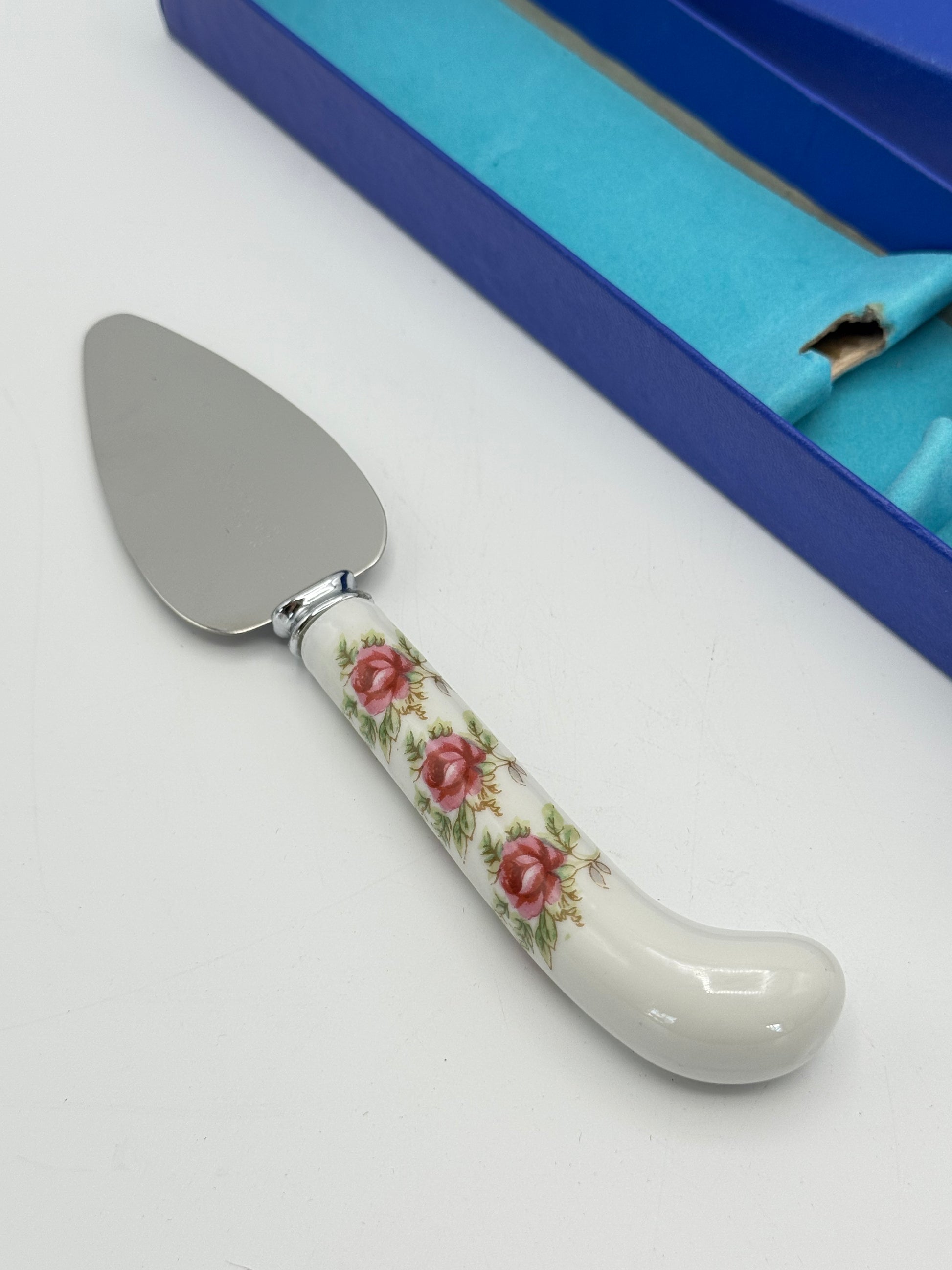 Lovely vintage PRILL Sheffield England cheese or pie server with a porcelain floral handle, presented in its original fitted box. This 7” server features a stainless steel triangular blade and a porcelain handle decorated with delicate pink roses, adding a touch of English charm to any table setting.